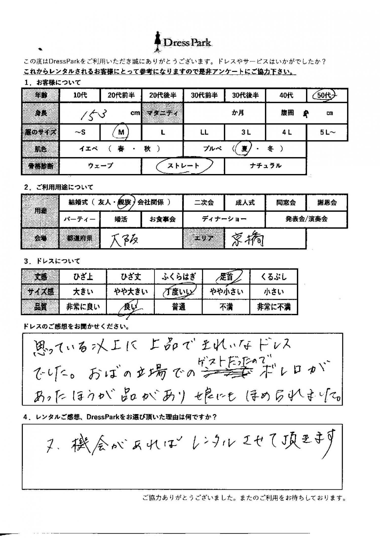 思っている以上に上品で綺麗なドレスでした。叔母の立場でのゲストだったので、ボレロがあった方が品があり、娘にも褒められました。レンタルのご感想、