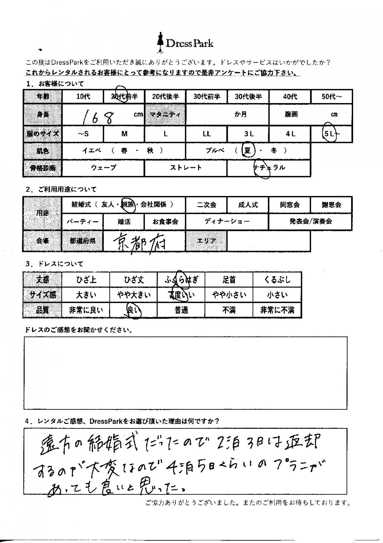 遠方の結婚式だったので、2泊3日は返却するのが大変なので、4泊5日位のプランがあってもいいと思った。