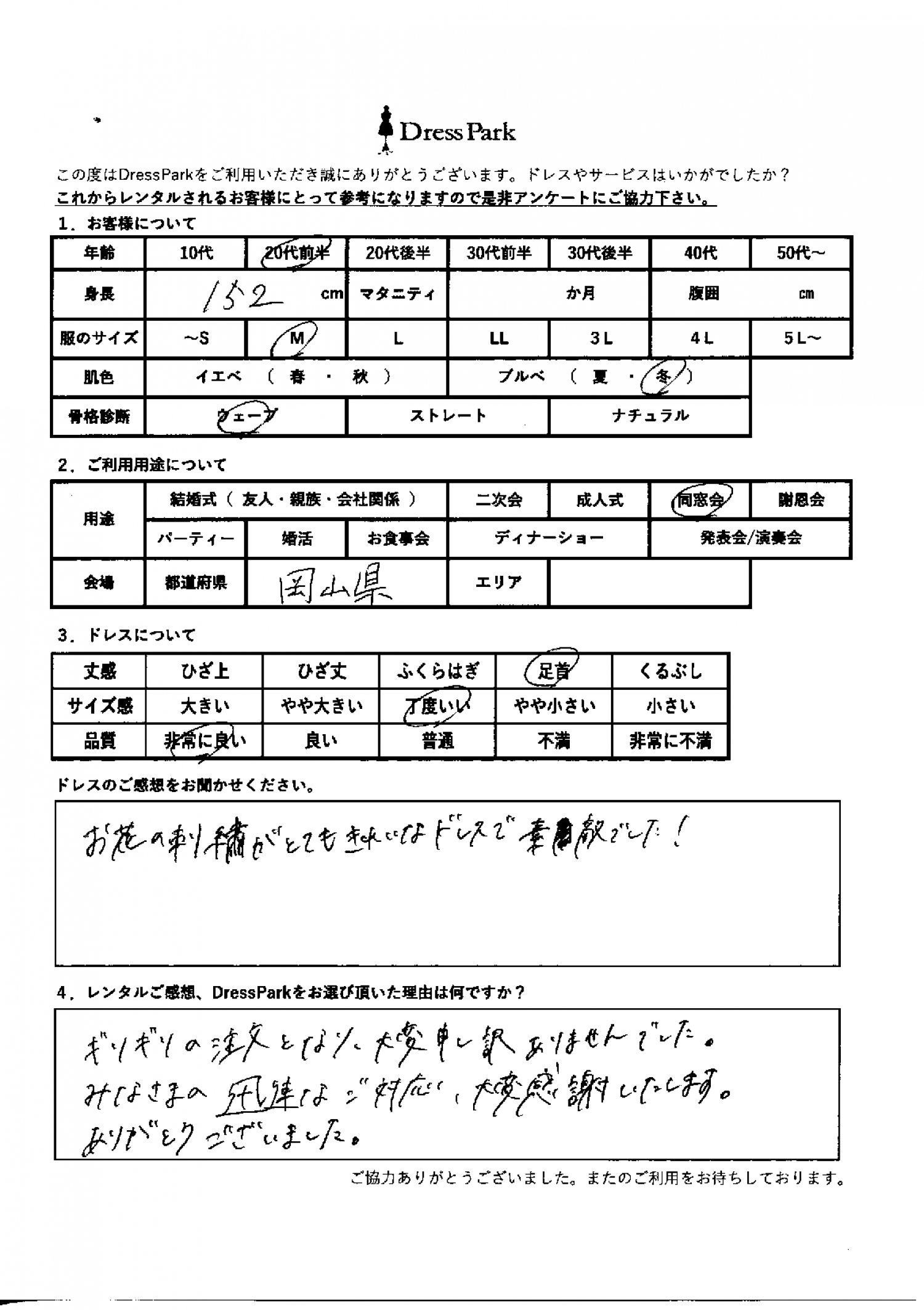 お花の刺繍がとてもきれいなドレスで素敵でした!レンタルのご感想、