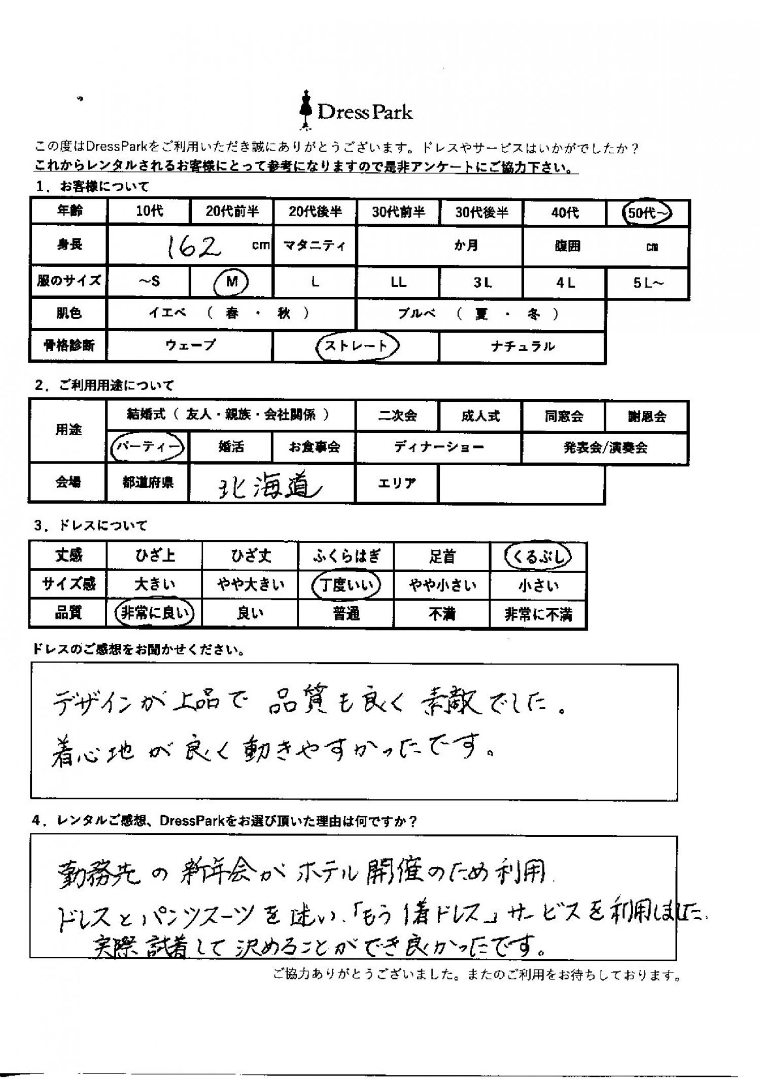 勤務先の新年会がホテル開催のため利用。ドレスとパンツスーツを迷い「もう1着ドレス」サービスを利用しました。実際試着して決めることができてよかったです。