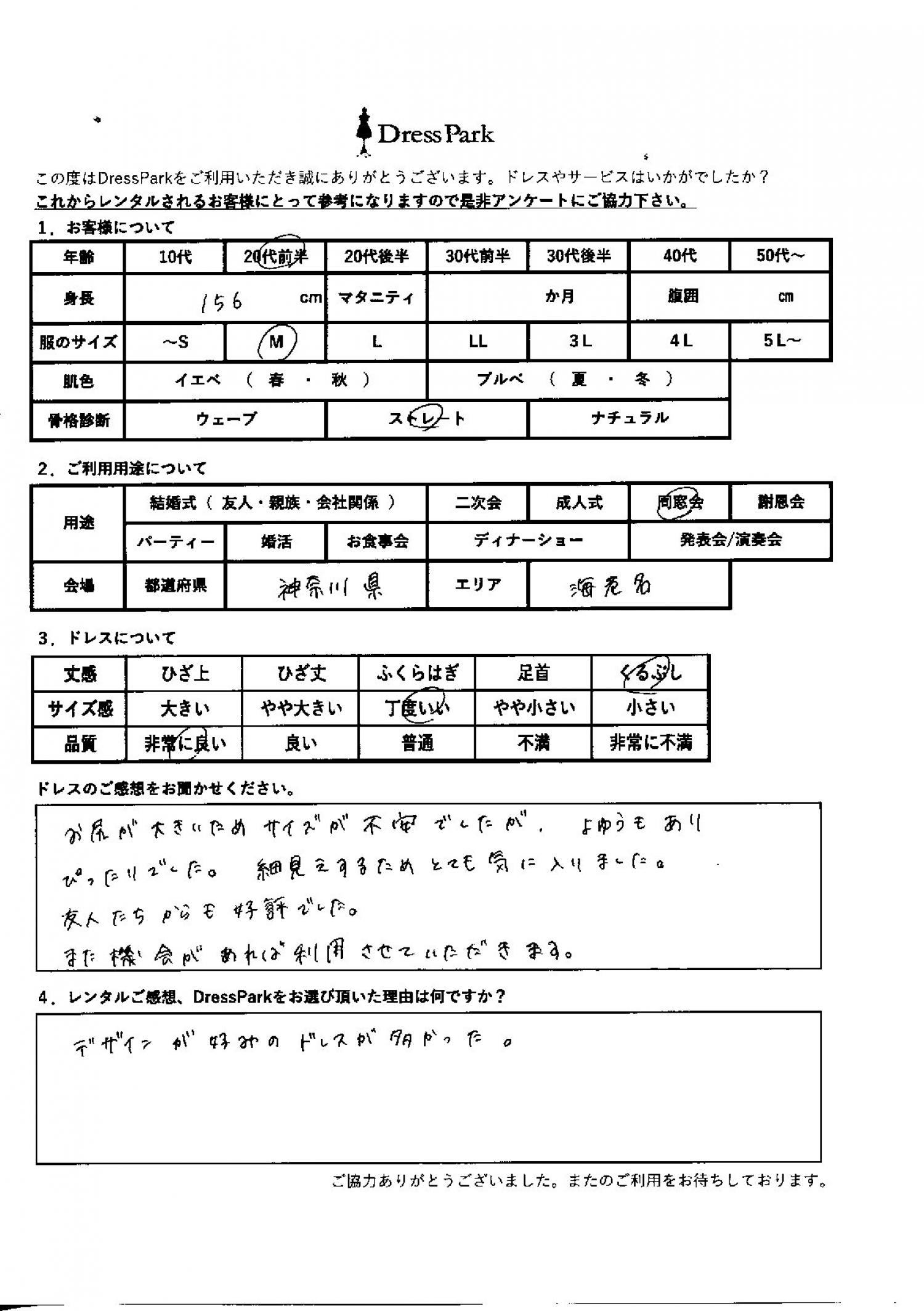お尻が大きいためサイズが不安でしたが、余裕もありぴったりでした。細見えするためとても気に入りました。友人たちからも好評でした。また機会があれば利用させていただきます。レンタルのご感想、