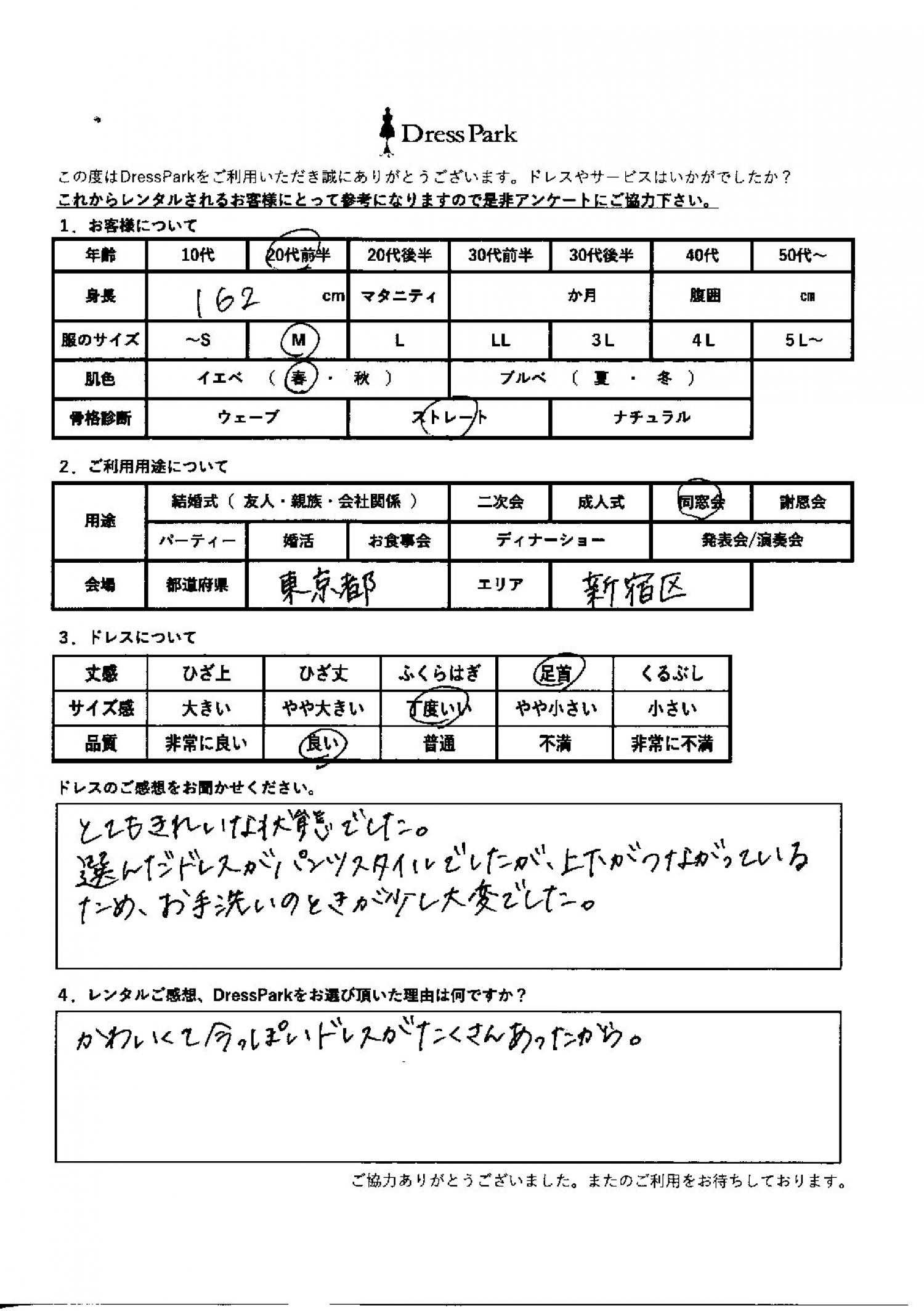 とてもきれいな状態でした。選んだドレスがパンツスタイルでしたが、上下がつながっているため、お手洗いの時が少し大変でした。レンタルのご感想、