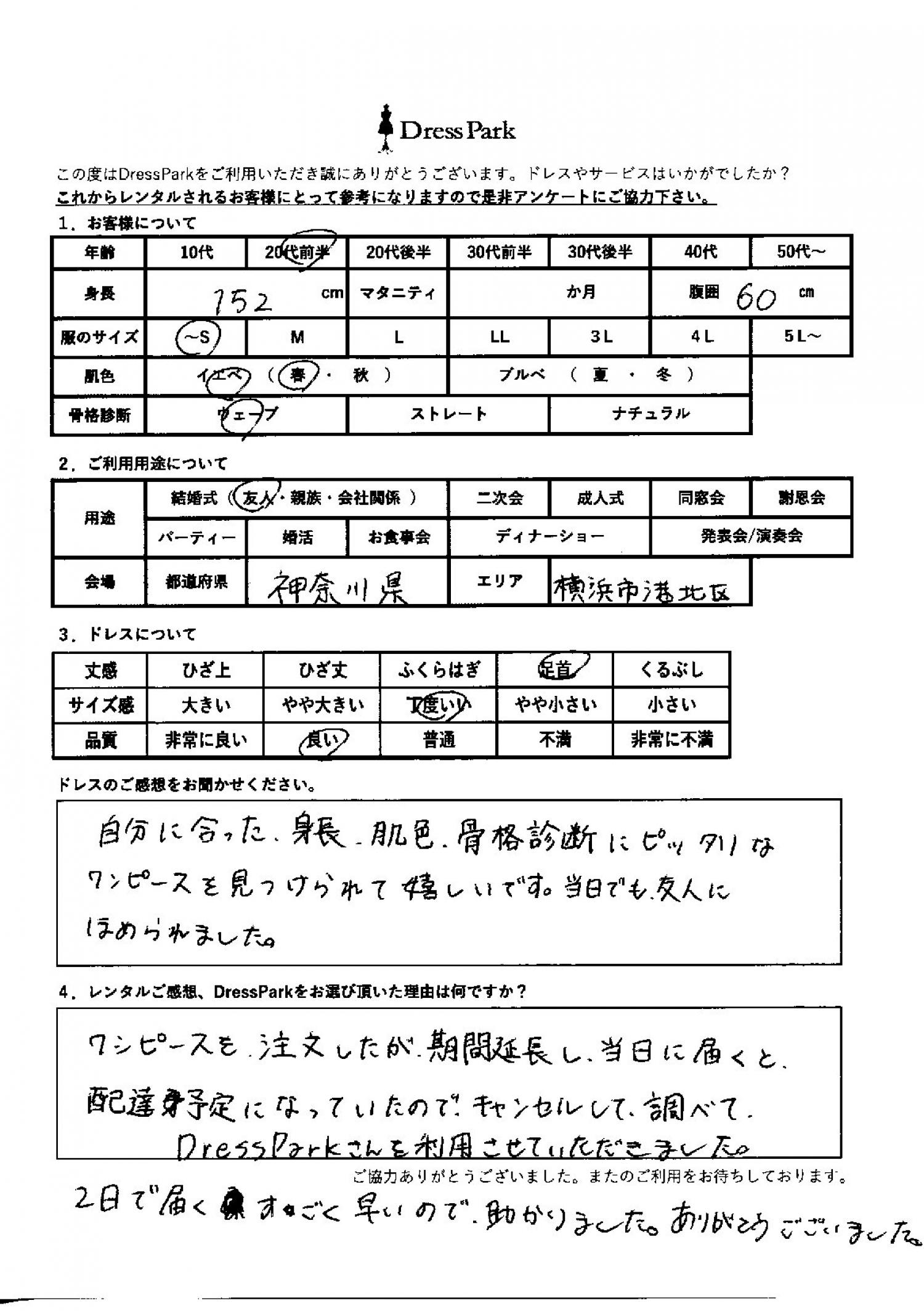 自分に合った身長、肌色、骨格診断にぴったりのワンピースを見つけられてうれしいです。当日でも友人に褒められました。レンタルのご感想、