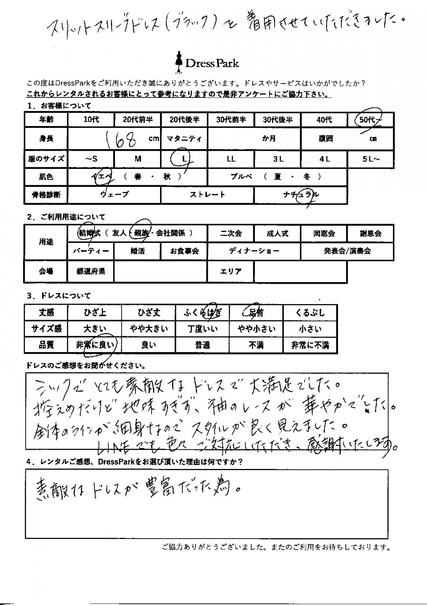 シックでとても素敵なドレスで大満足でした。控えめだけど、地味すぎず、袖のレースが華やかでした。全体のラインが細身なので、スタイルがよく見えました。LINEでもいろいろご対応いただき感謝いたします。レンタルのご感想、