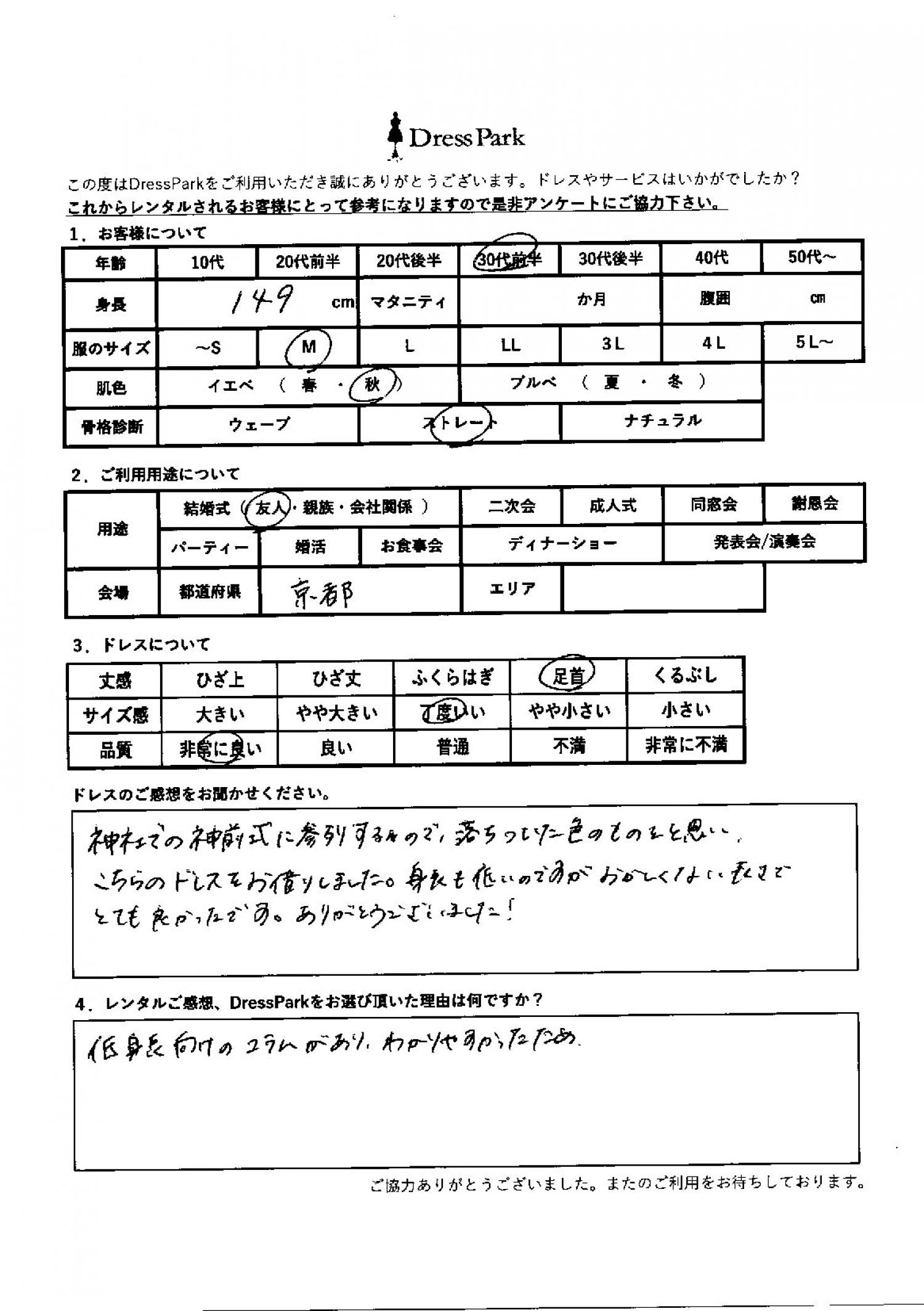神社での神前式に参列するので、落ち着いた色のものをと思い、こちらのドレスをお借りしました。身長も低いのですが、おかしくない長さでとても良かったです。ありがとうございました!レンタルのご感想、