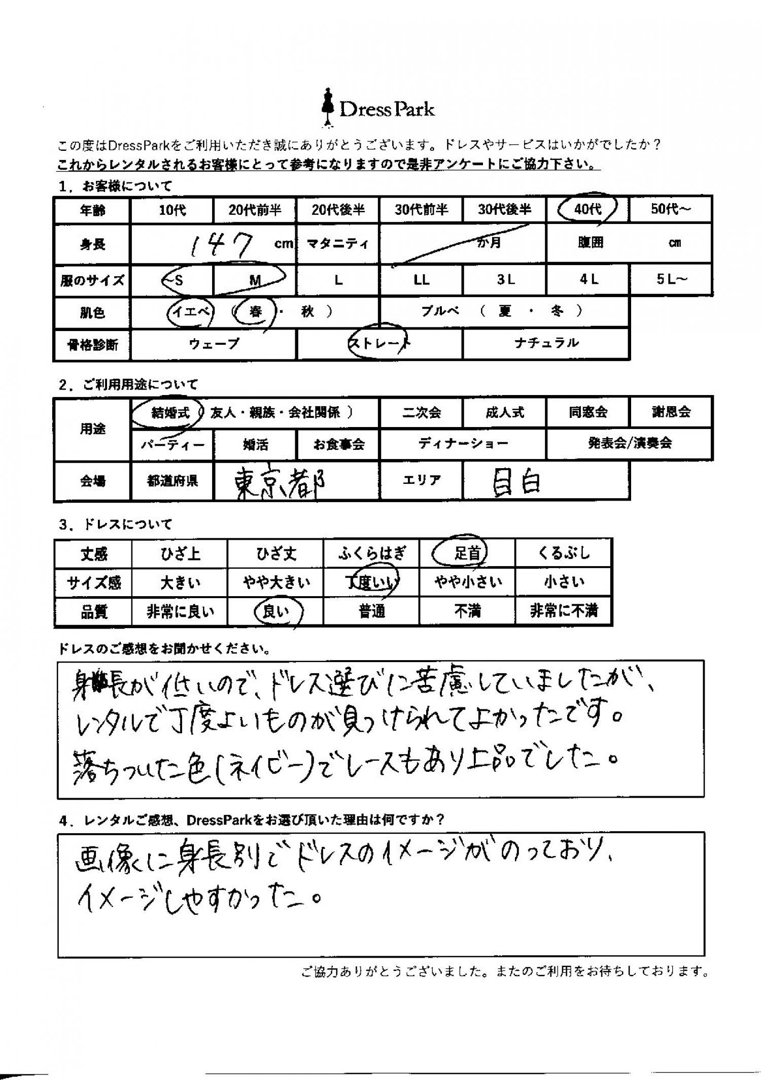 身長が低いので、ドレス選びに苦慮していましたが、レンタルでちょうど良いものが見つけられてよかったです。落ち着いた色(ネイビー)でレースもあり上品でした。レンタルのご感想、