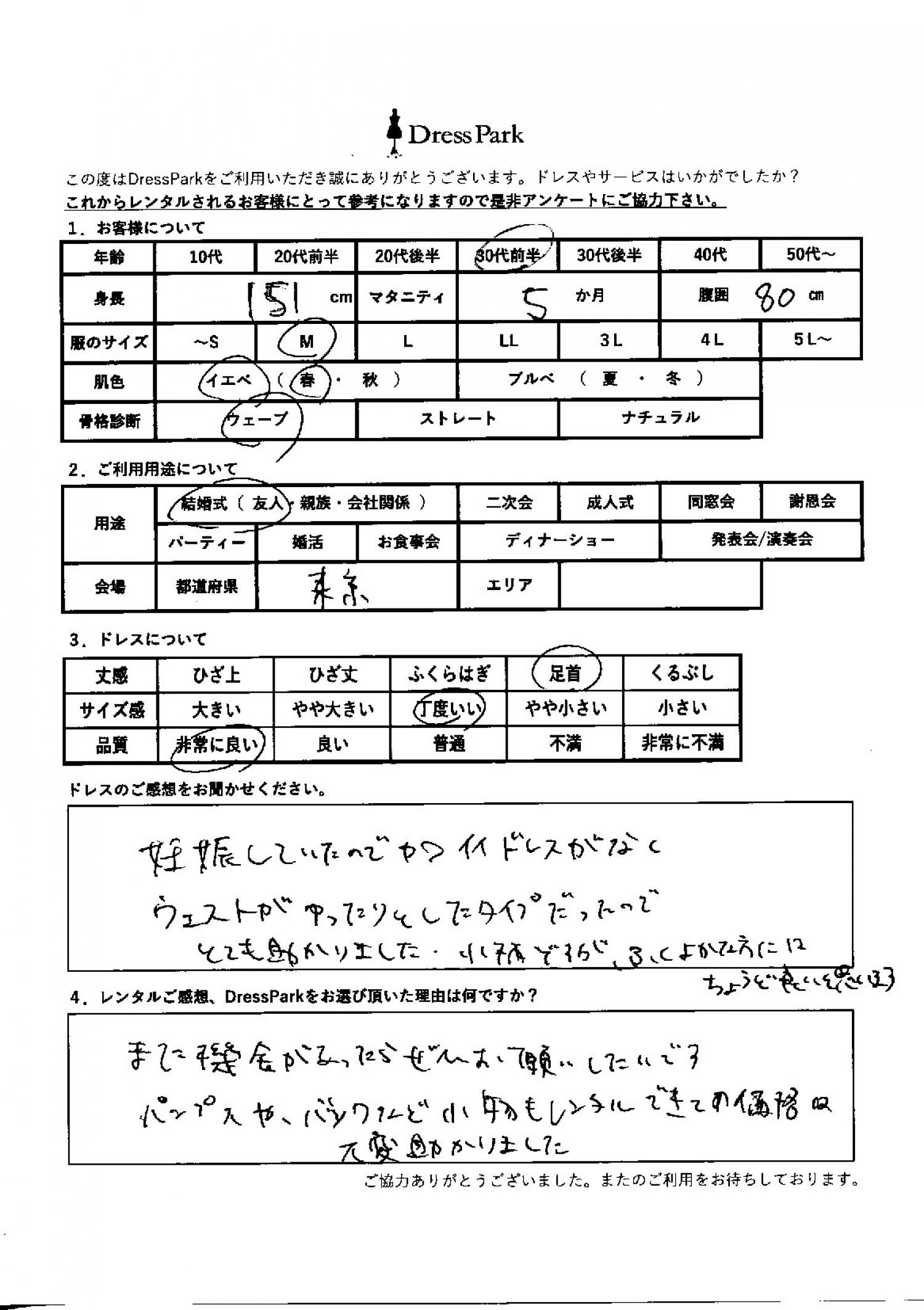 妊娠していたので、かわいいドレスがなく、ウェストがゆったりとしたタイプだったのでとても助かりました。小柄ですが、ふくよかな方にはちょうどいいと思います。レンタルのご感想、