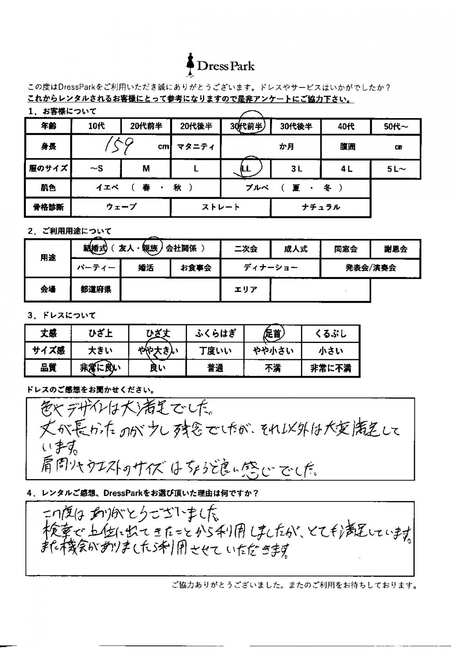 色やデザインは大満足でした。丈が長かったのが少し残念でしたが、それ以外は大変満足しています。肩周りやウェストのサイズはちょうど良い感じでした。レンタルのご感想、