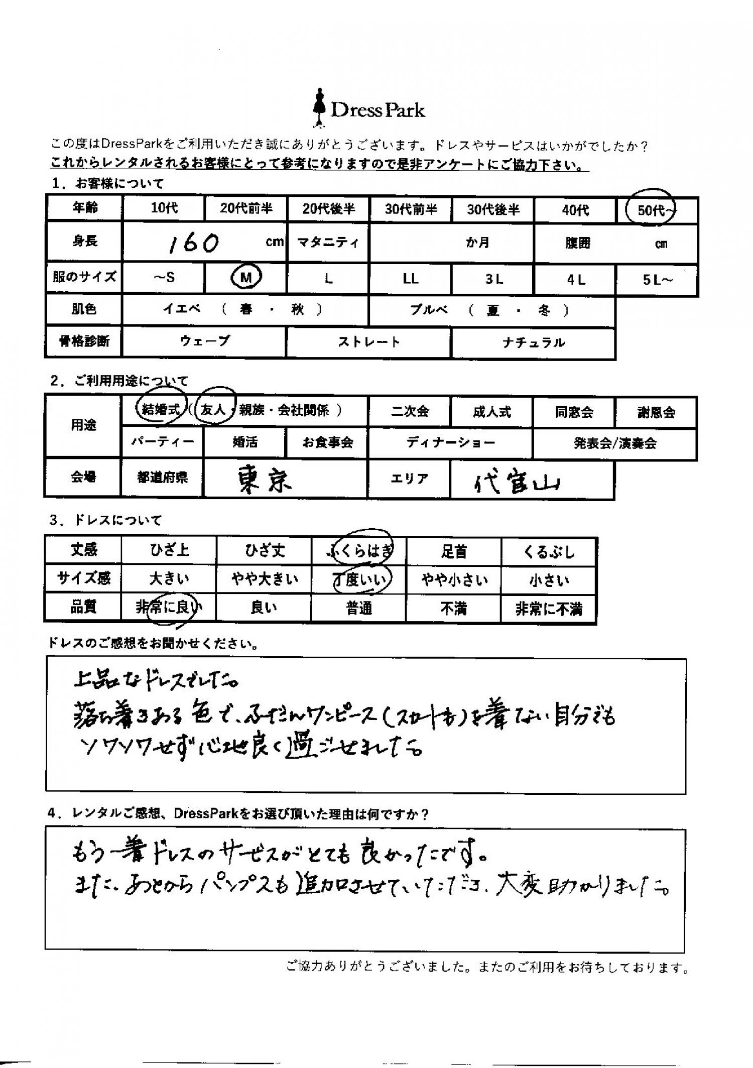 上品なドレスでした。落ち着きある色で普段ワンピース(スカート)を着ない自分でも、そわそわせず心地よく過ごせました。レンタルのご感想、