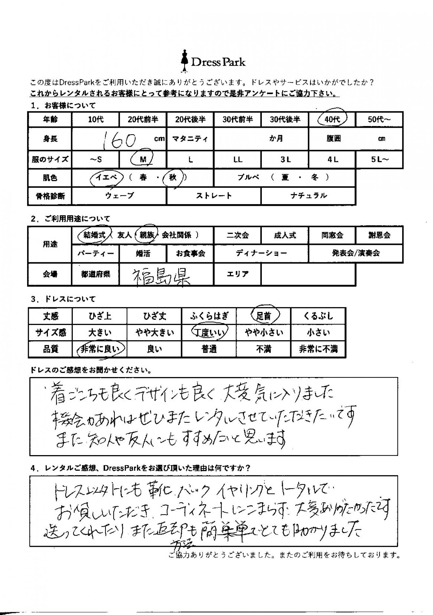着心地も良く、デザインも良く大変気に入りました。機会があればまたぜひレンタルさせていただきたいです。また知人や友人にも進めたいと思います。レンタルのご感想、
