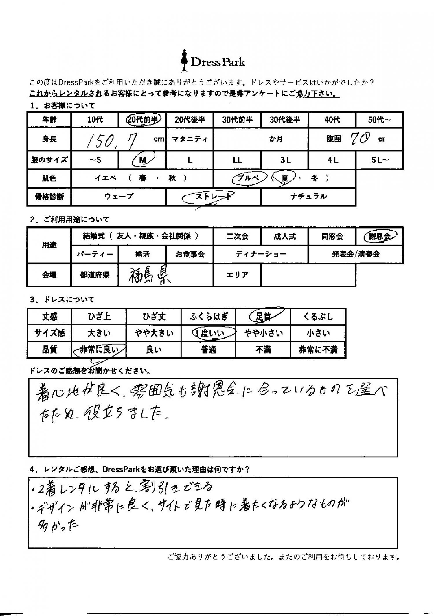 着心地が良く、雰囲気も謝恩会に合っているのを選べたため役立ちました。レンタルのご感想、