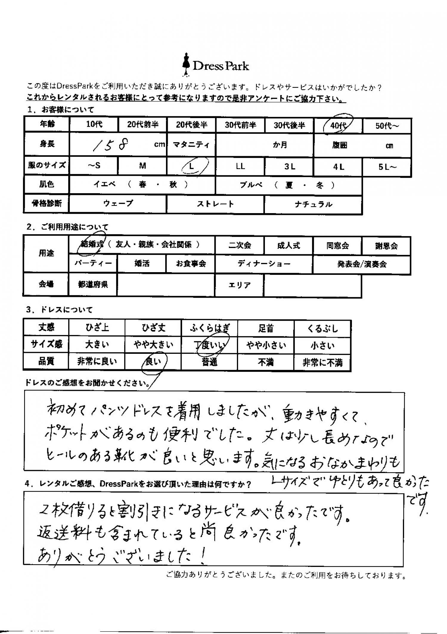 初めてパンツドレスを着用しましたが、動きやすくてポケットがあるのも便利でした。丈は少し長めなので、ヒールのある靴が良いと思います。気になるお腹周りもLサイズでゆとりもあってよかったです。レンタルのご感想、