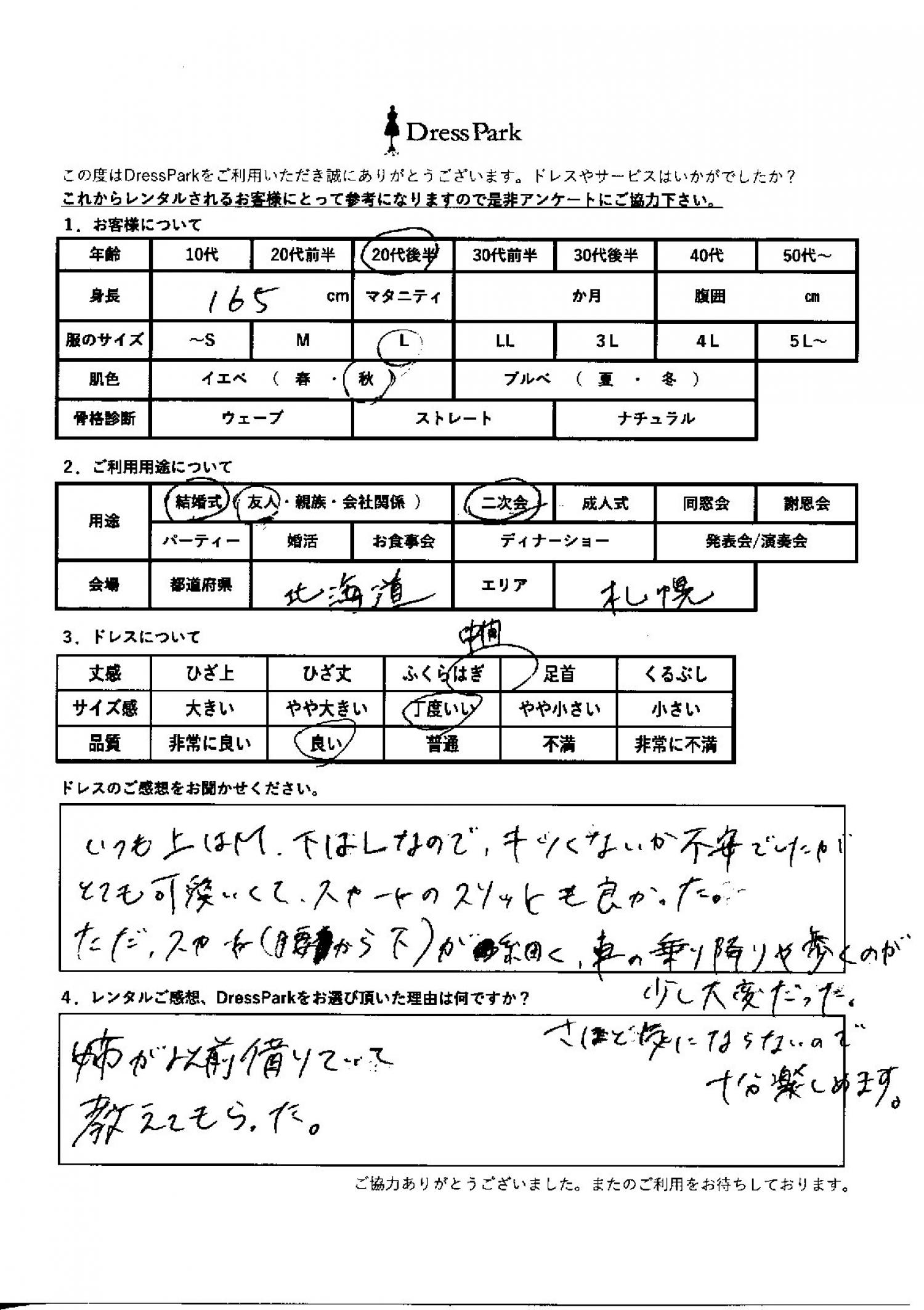 いつも上はM、下はLなのできつくないか不安でしたが、とても可愛くてスカートのスリットも良かった。ただスカート(腰から下)が細く車の乗り降りや歩くのが少し大変だった。さほど気にならないので充分楽しめます。レンタルのご感想、