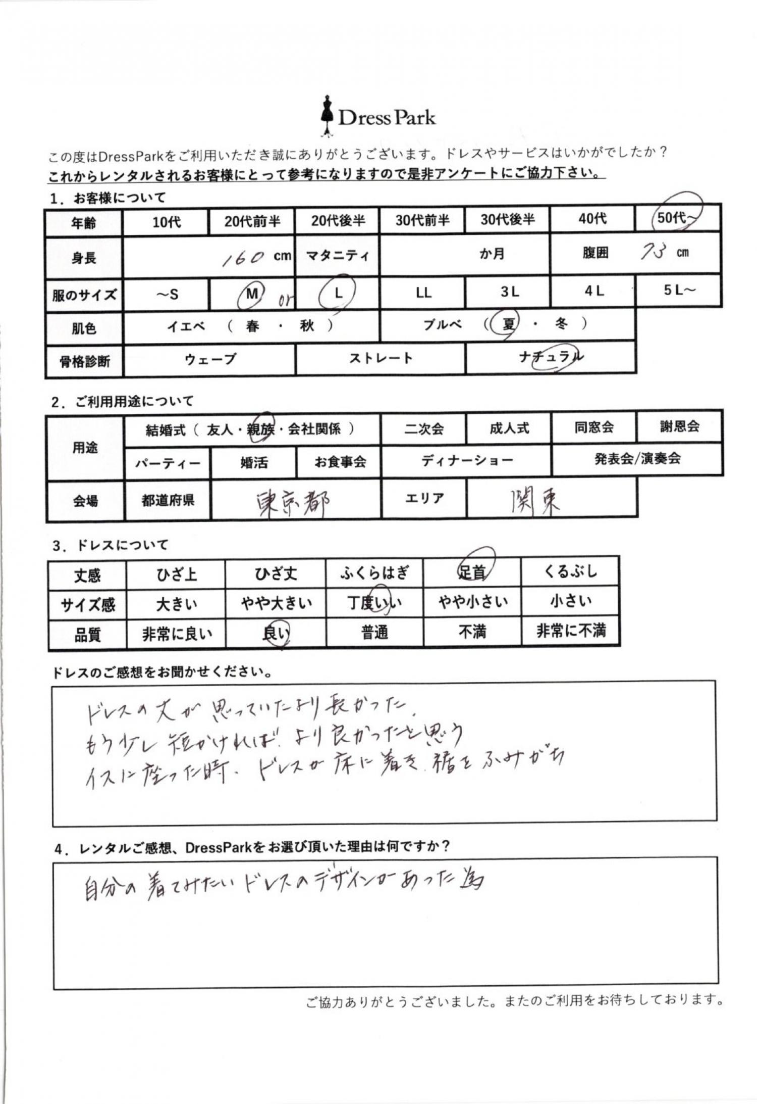 ドレスの丈が思っていたより長かった。もう少し短ければより良かったと思う。椅子に座った時、ドレスが床につき裾を踏みがち。レンタルのご感想、