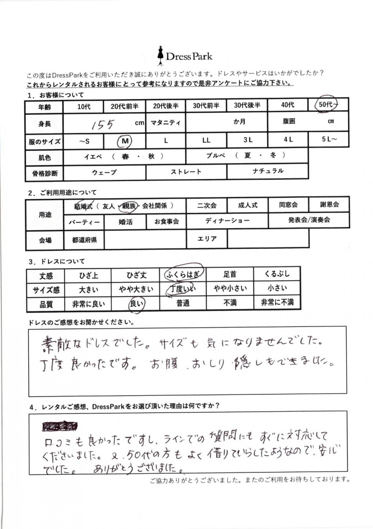 素敵なドレスでした。サイズも気になりませんでした。ちょうど良かったです。お腹、お尻隠しもできました。レンタルのご感想、