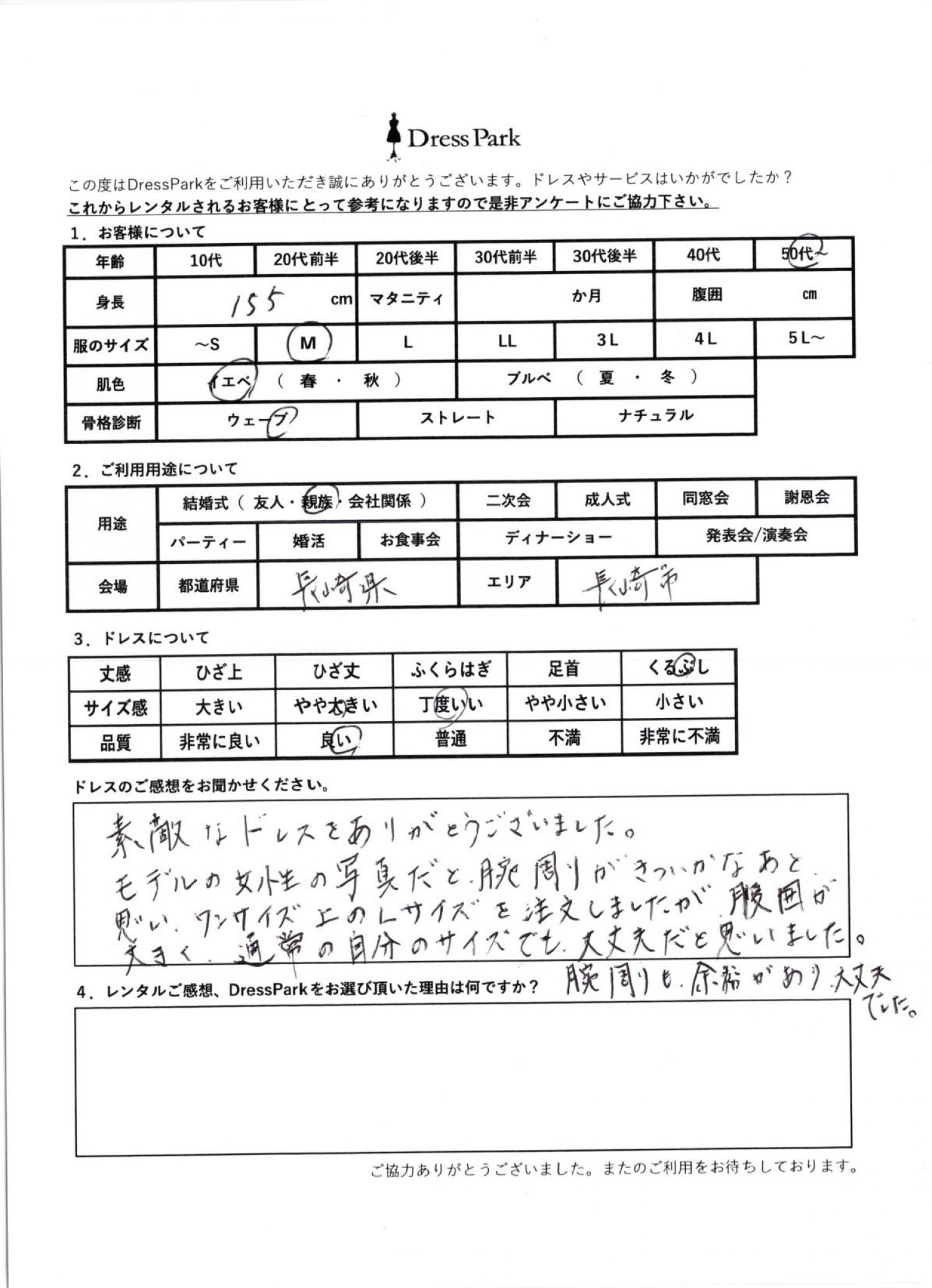 素敵なドレスをありがとうございました。モデルの女性の写真だと腕回りがきついかなぁと思い、ワンサイズ上のLサイズを注文しましたが、福井が大きく通常の自分のサイズでも大丈夫だと思いました。腕回りも余裕があり大丈夫でした。CUSTOMER REVIEWS お客様の声