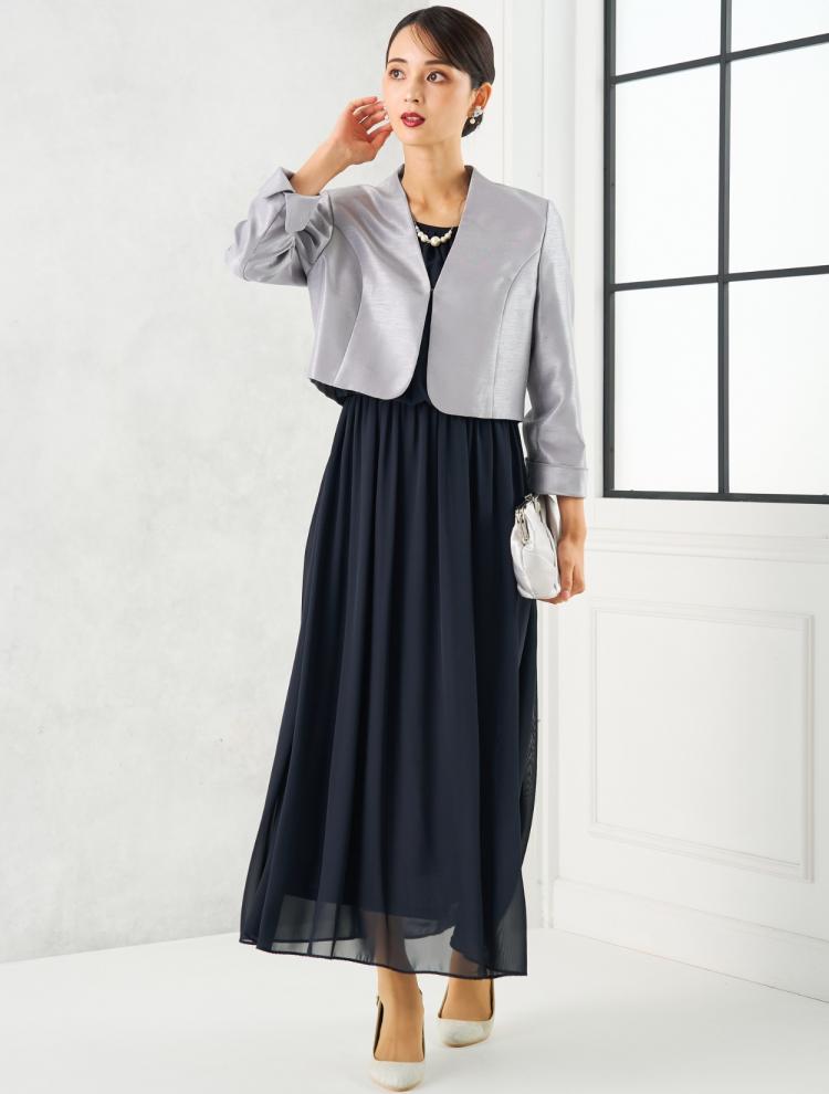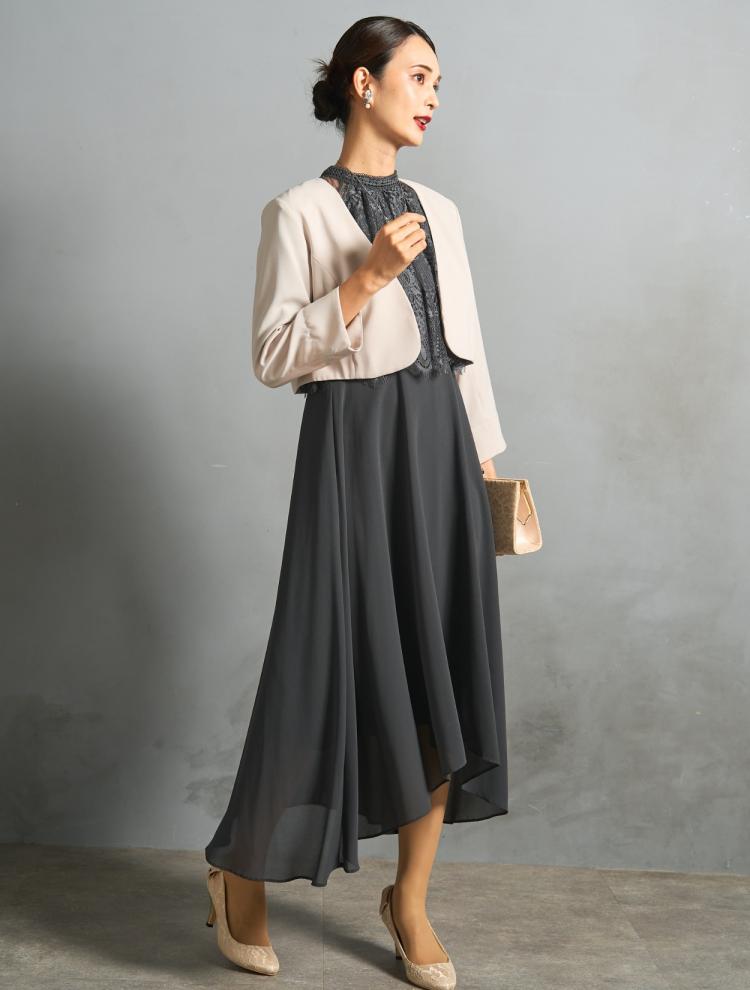 控えめで良いけど、地味すぎるのも…とお悩みのお客様。裾のデザインがポイントのチャコールグレーのドレスに、程よい光沢のあるグレーのシャンタンジャケットを合わせたコーディネートをご提案。きちんと感のあるジャケットが差し色になり、流れるような美しいスカートのラインを気に入って下さいました。