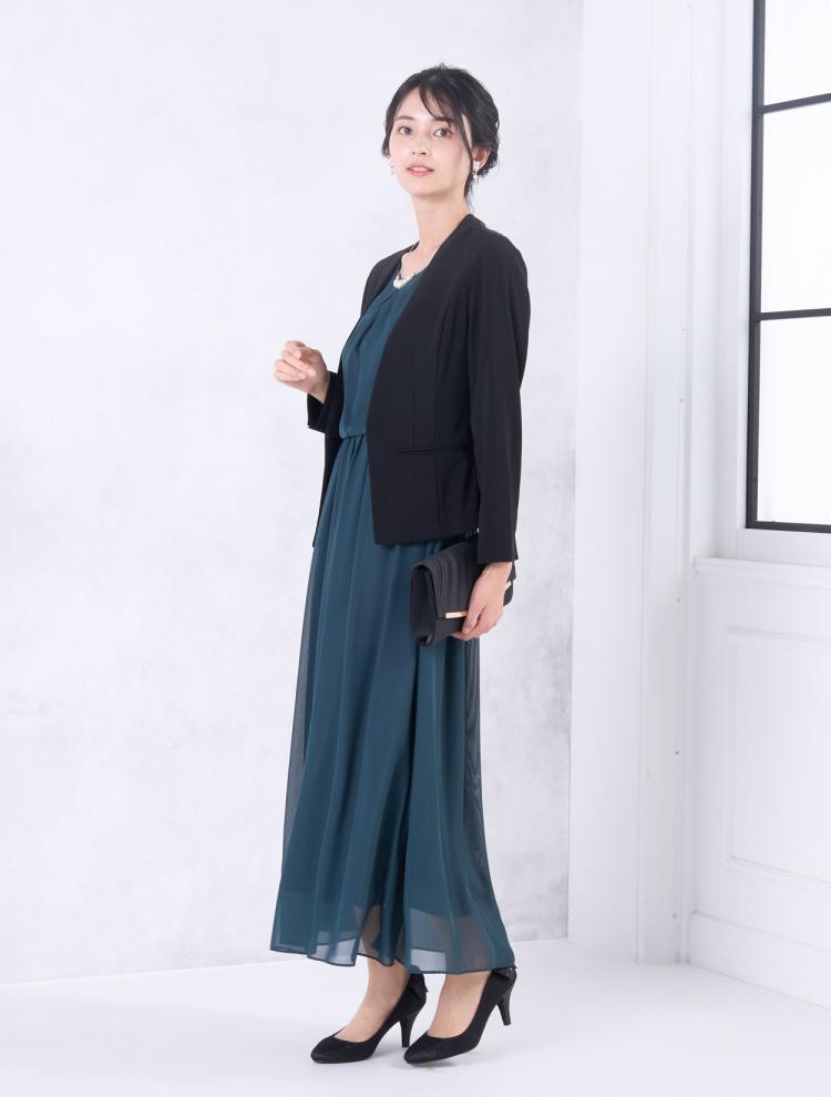 シックで落ち着きのあるブラックジャケットのコーデは50代以上の親族におすすめ。控えめな装いは新郎新婦を引き立て、ゲストを迎える立場としてもピッタリです。ブラックのジャケットは、カラードレスを親族向きにアップデートしてくれるアイテムでもあります。