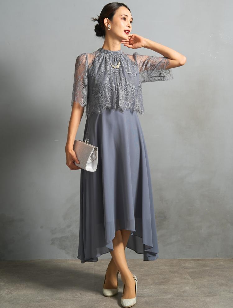 【M〜LL】レーストップスヘム裾ドレス(ブルーグレー)