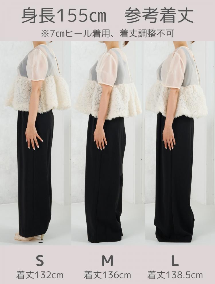 身長155㎝のスタッフが、SMLサイズを着用した参考画像です。着丈が調節できない分、Mサイズでもかなり長め。8㎝以上のヒール着用や、会場のみでの利用がおすすめ。