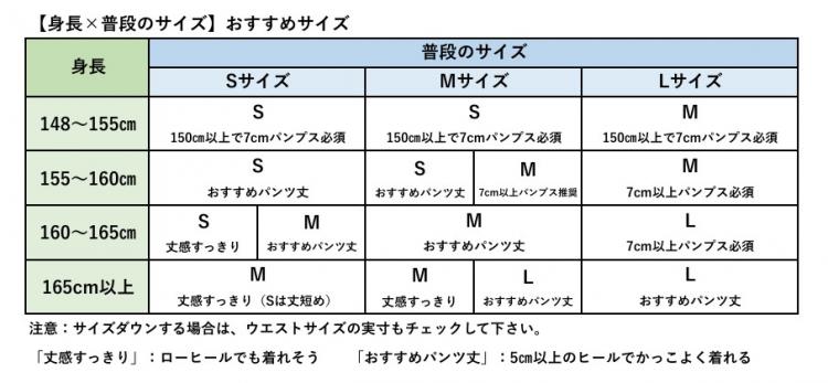 「身長×普段のサイズ別の選び方ガイド」や、148㎝・155㎝・165㎝のスタッフが実際に着用した画像もあるので、是非参考にしてみて下さい。