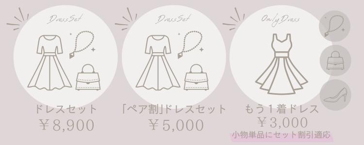 ・「ペア割ドレスセット」にパンプスや羽織の小物単品を追加した場合も、セット割引(1,000円割引)が適応されます。