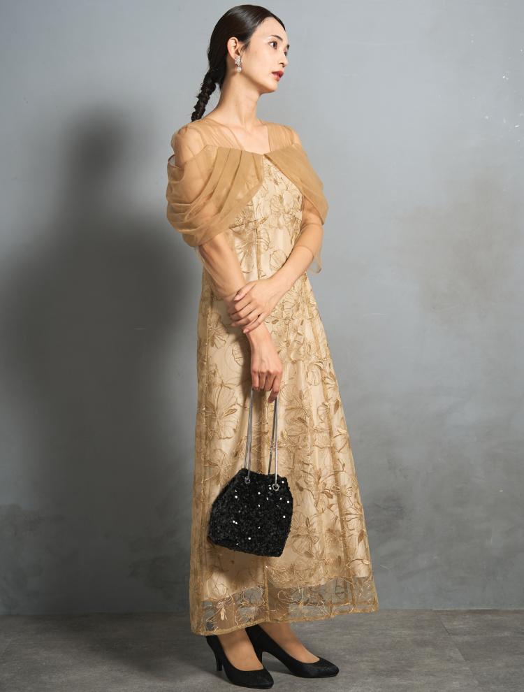 「上半身が華やかなデザイン」のドレスを選びましょう!アーティストとのツーショット撮影はもちろん、お友達との思い出写真も華やかに残せます。また、ディナーショーは着席がほとんどなので、上半身の華やかさは重要です。