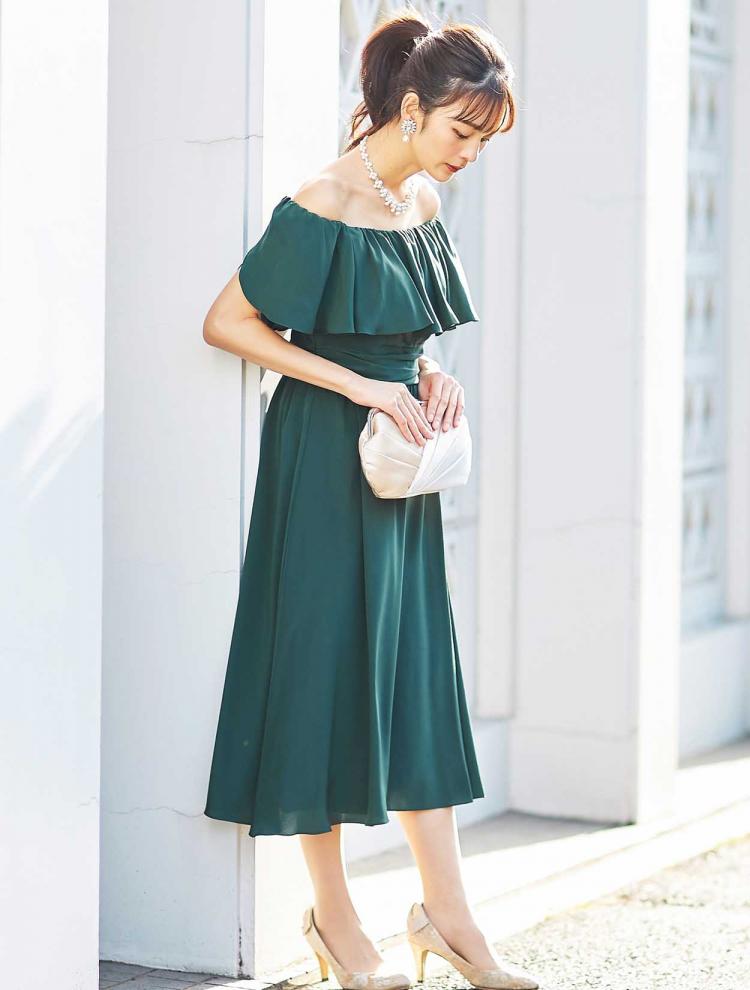 ディナーショーといえばクリスマス。クリスマスカラーの「グリーン」と「レッド」のドレスも季節感がありおすすめです。深みのあるカラーは締め色でもあるので、着痩せ効果も◎。