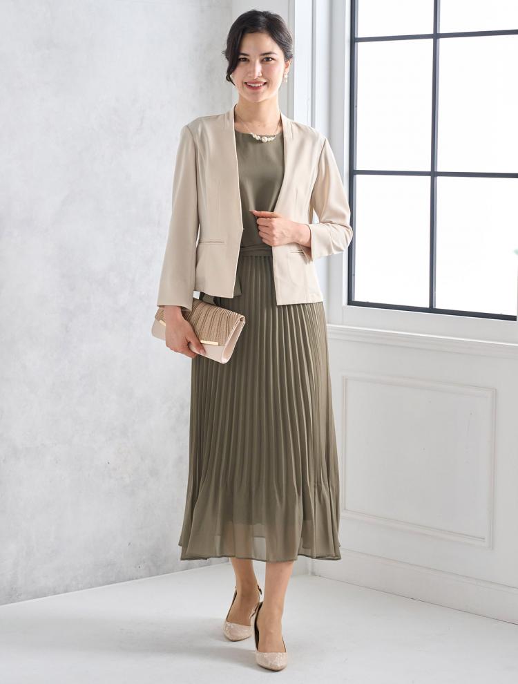上品なワンピースや、ブラウス×スカートコーデ、セットアップもフォーマル感がありおすすめ。Tシャツやデニム、トレーナー、サンダルなどのカジュアルな普段着はNG。