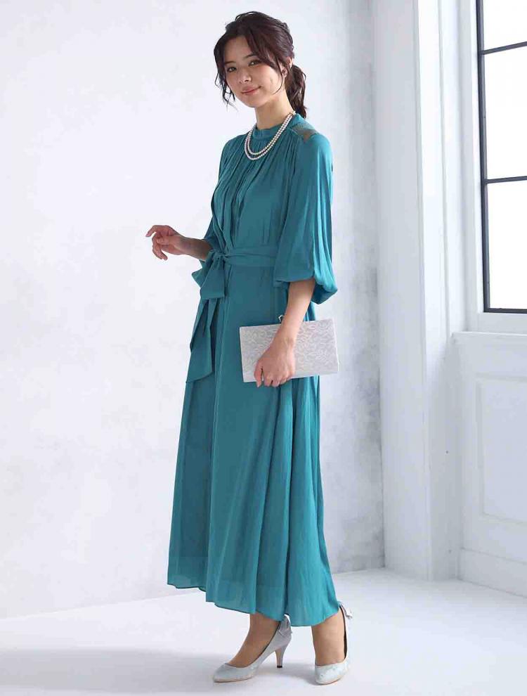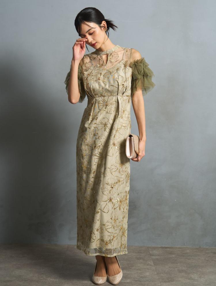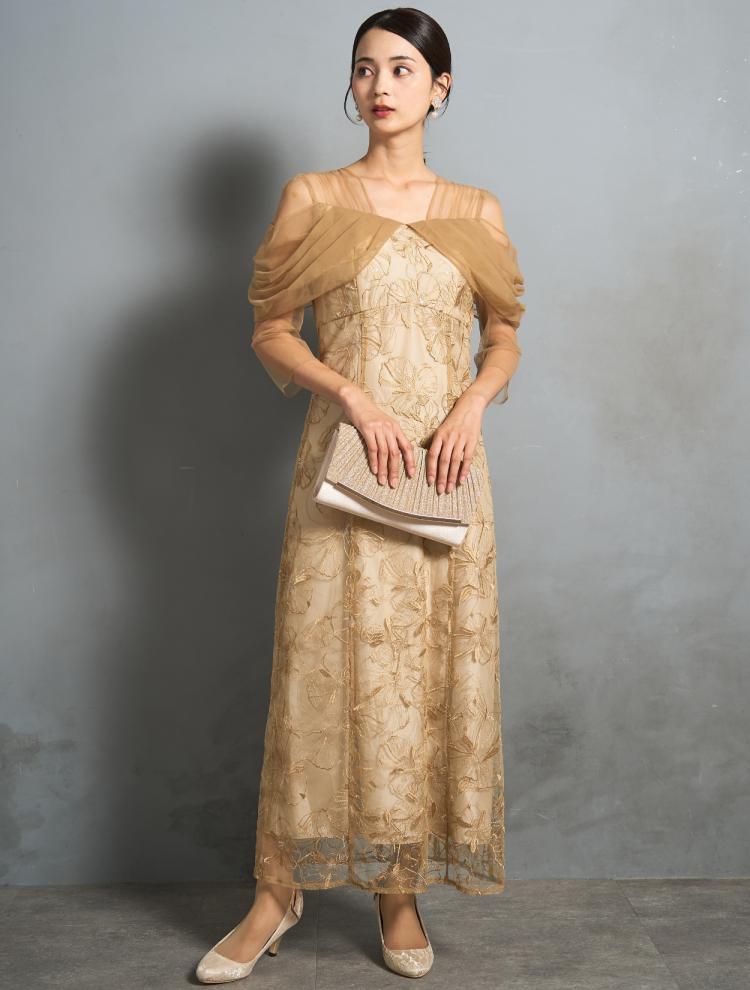 ただフォーマルドレスは、露出を抑えるために首元はつまり気味のデザインが多いです。そんな時は「デコルテに透け感のあるデザイン」を選ぶと◎。