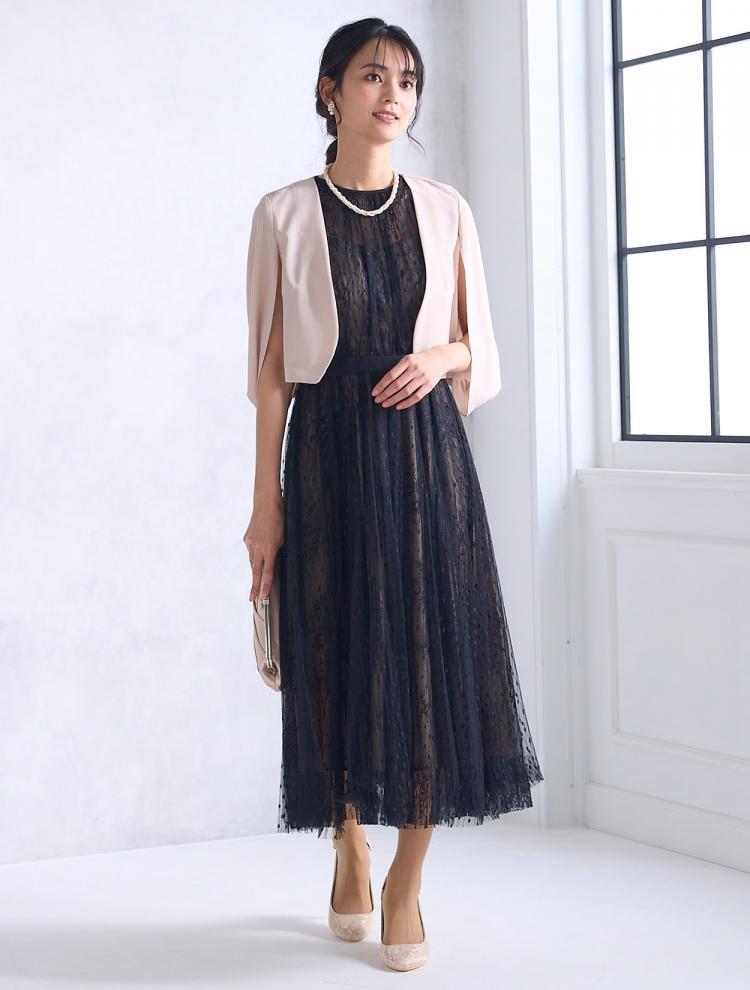 細かいドット柄がポイントのドレス。全体の配色をシックにまとめると、親族らしい着こなしができます。広がらないスカートは、落ち着いた大人の雰囲気に。