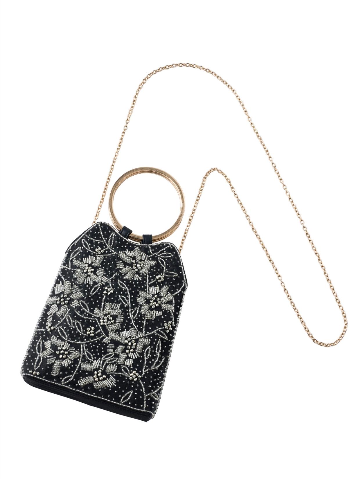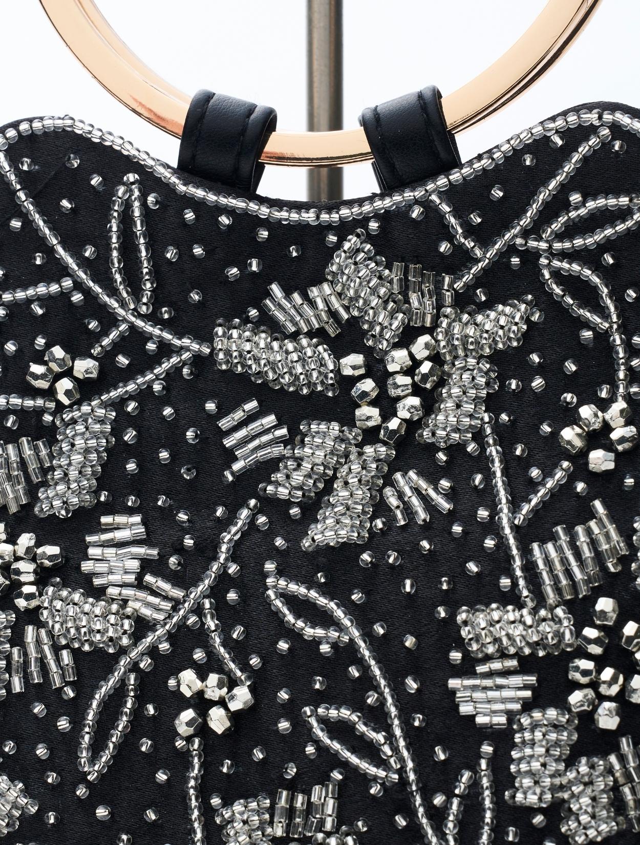 ビーズの刺繍が施された上品なパーティーバッグ。リングバッグのデザインは、従来のパーティーバッグよりもラフに持てるので20代30代に人気。刺繍はクラシカルな印象で高級感もあるので、40代50代の方にももちろんおすすめです。ショルダーストラップが付いているので、肩掛けにしてご利用も可能です。ブラックカラーですが、刺繍が華やかで地味見えしません。カラードレスのアクセントにも、ブラックドレスのシックな着こなしにもおすすめのアイテムです。