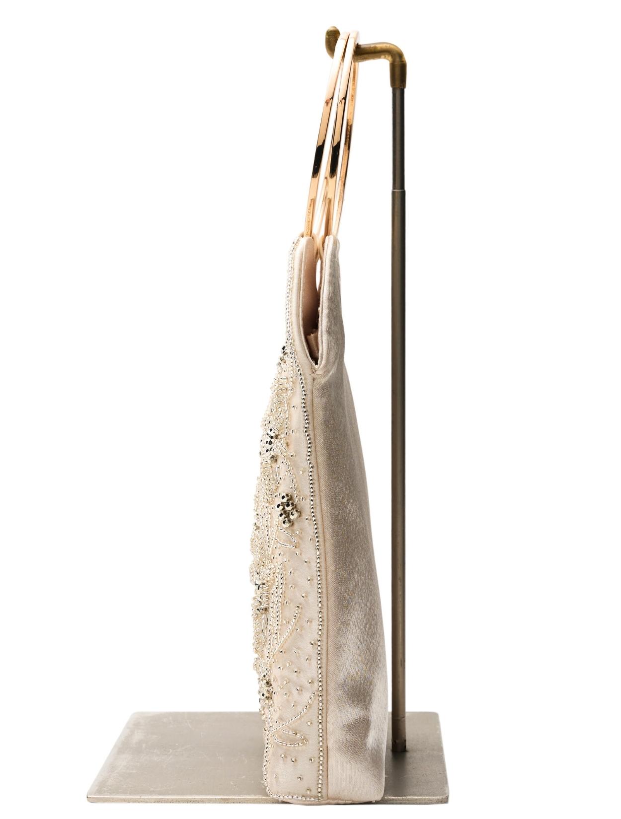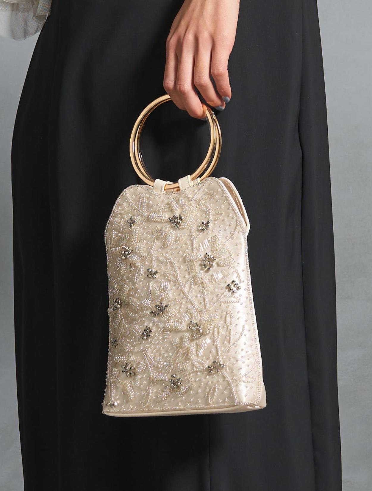 ビーズの刺繍が施された上品なパーティーバッグ。リングバッグのデザインは、従来のパーティーバッグよりもラフに持てるので20代30代に人気。刺繍はクラシカルな印象で高級感もあるので、40代50代の方にももちろんおすすめです。ショルダーストラップが付いているので、肩掛けにしてご利用も可能です。優しいベージュカラーは、上品で女性らしいコーディネートにおすすめのカラーです。