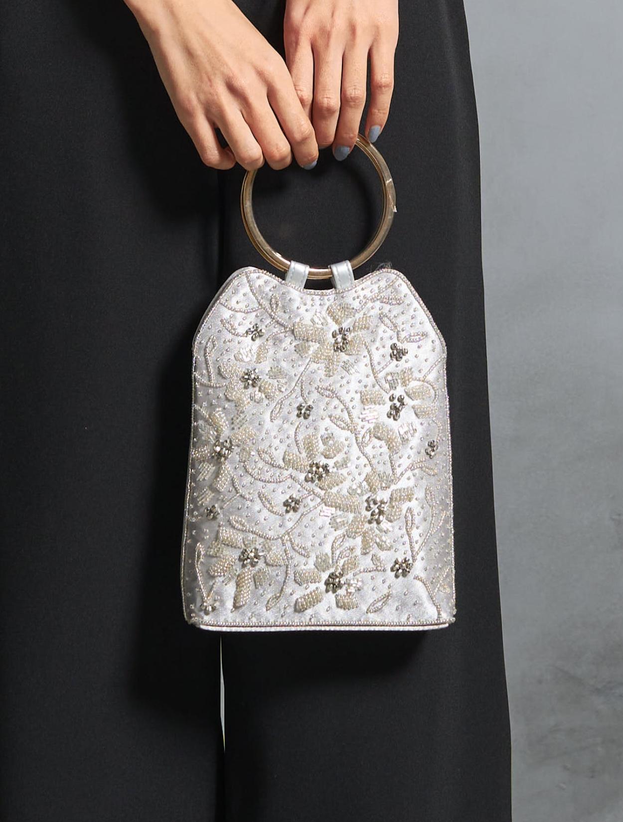 ビーズの刺繍が施された上品なパーティーバッグ。リングバッグのデザインは、従来のパーティーバッグよりもラフに持てるので20代30代に人気。刺繍はクラシカルな印象で高級感もあるので、40代50代の方にももちろんおすすめです。ショルダーストラップが付いているので、肩掛けにしてご利用も可能です。シルバー生地の光沢とビーズ刺繍の輝きは、すっきりとした清涼感のある印象に。お呼ばれからご親族コーデまで幅広くご利用可能です。