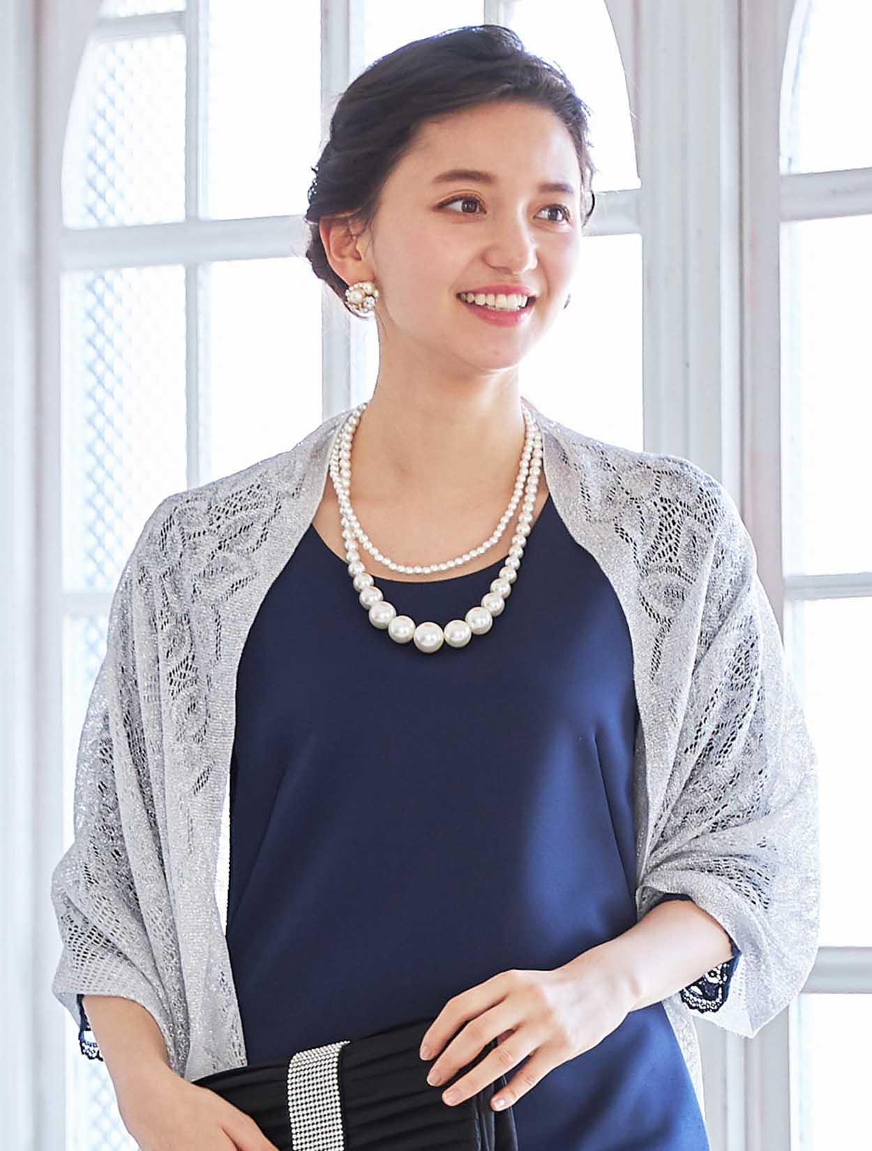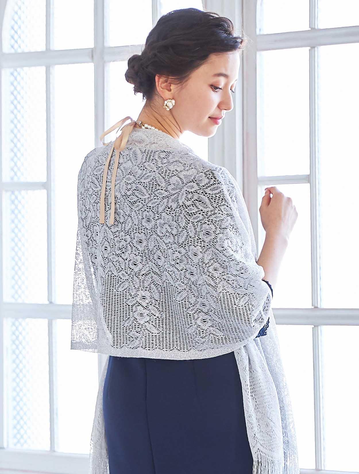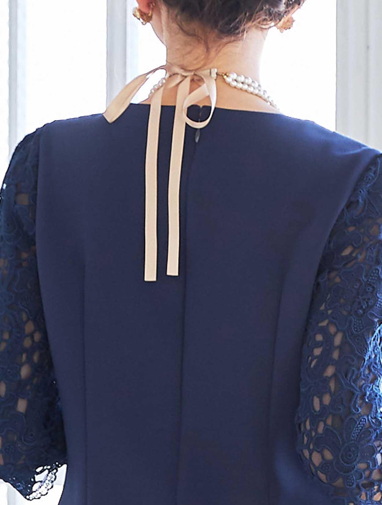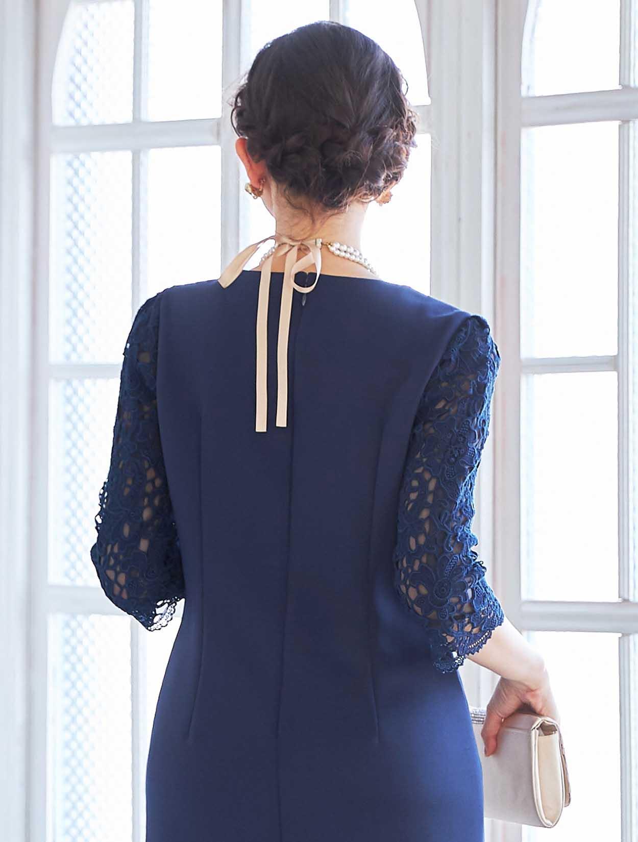 ネックレスはリボン結びをするデザインで、バックスタイルも華やかな表情に。