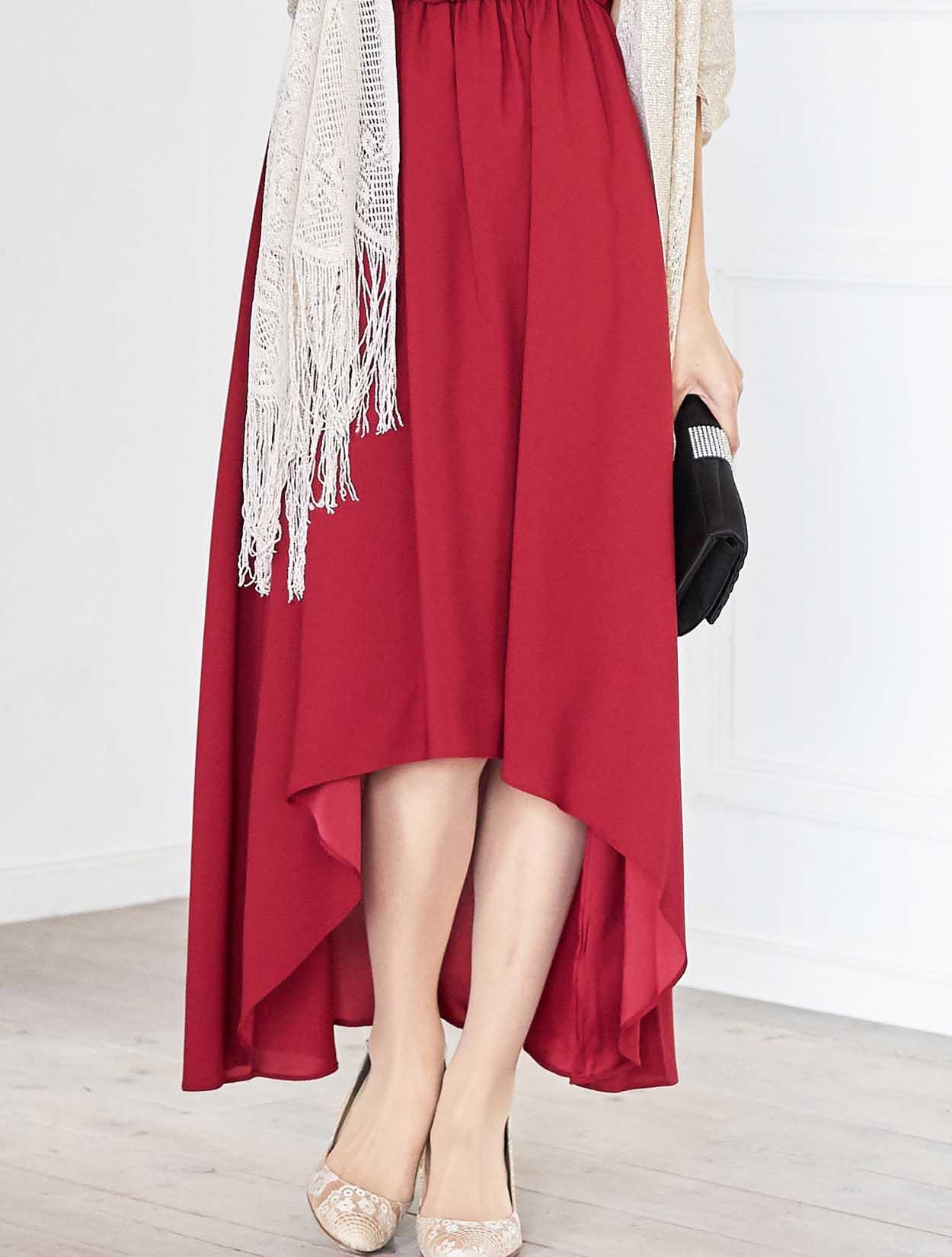 ドラマティックなレッドが華やかなミディ丈ドレス