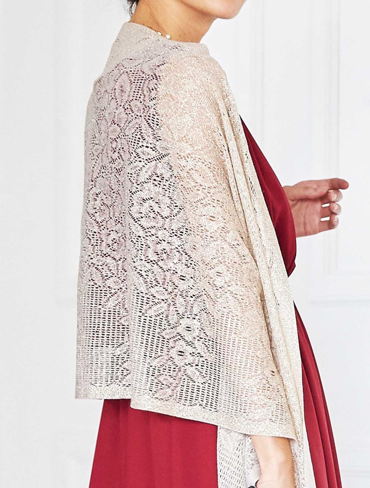 レッドのドレスが挑戦しにくい方でもゴールドベージュのストールと合わせていただくことで