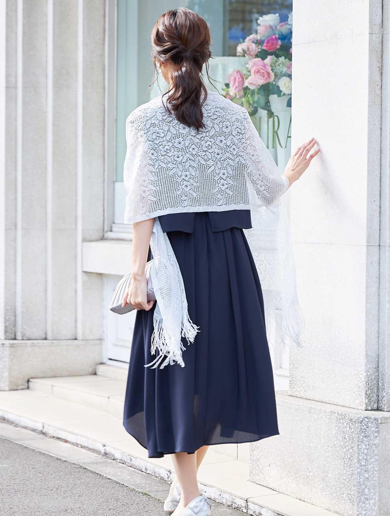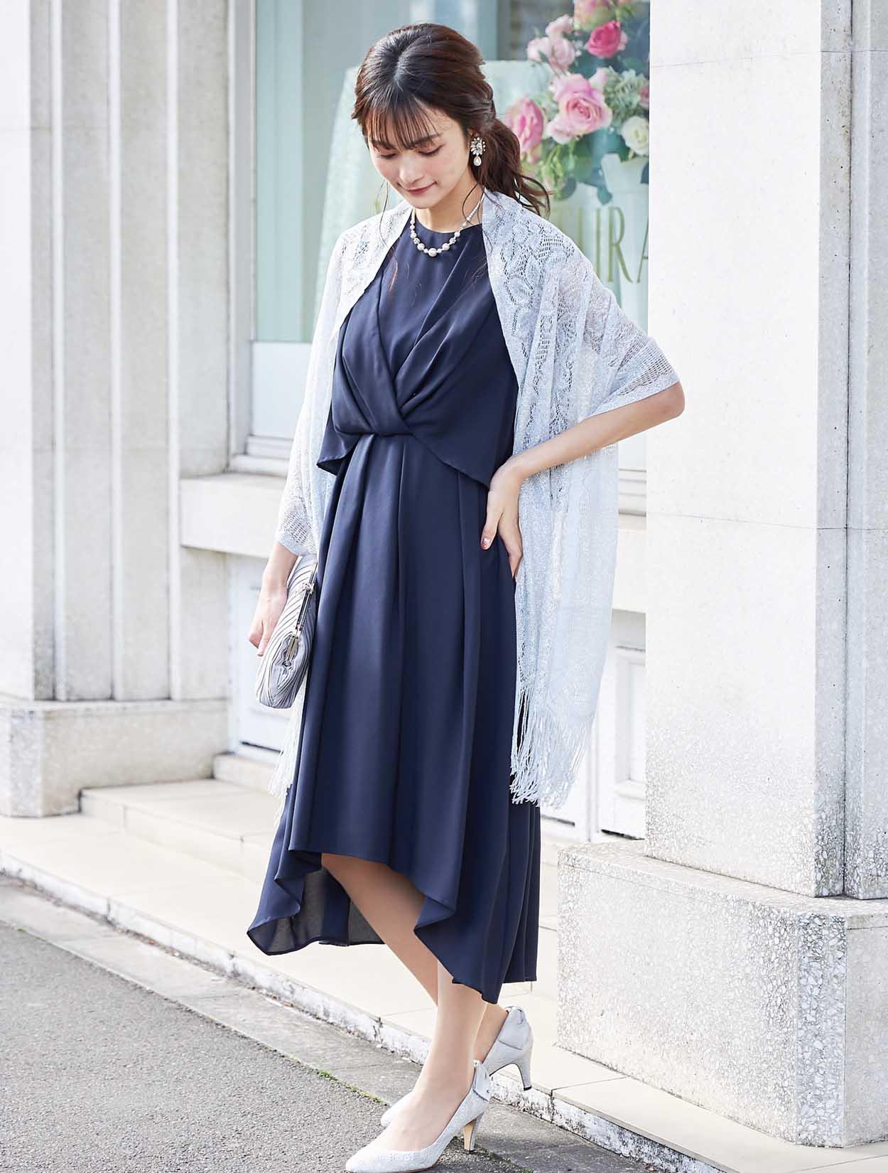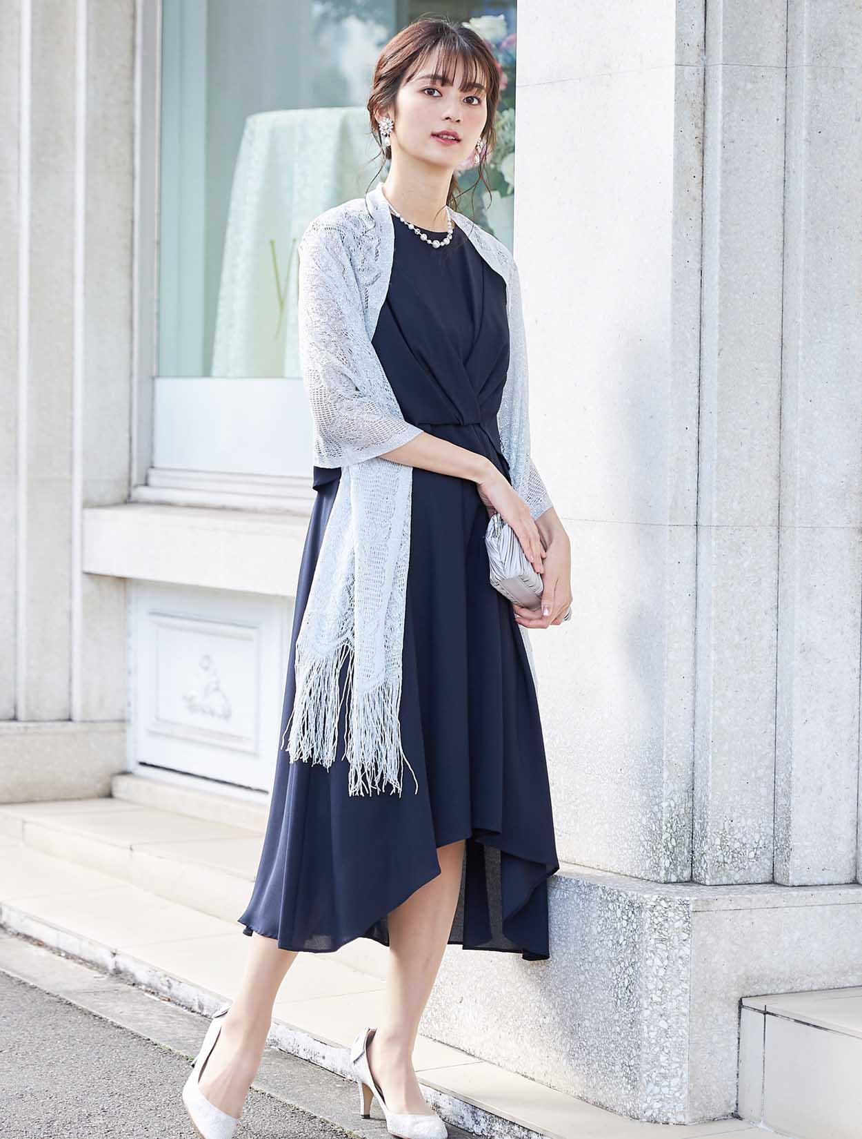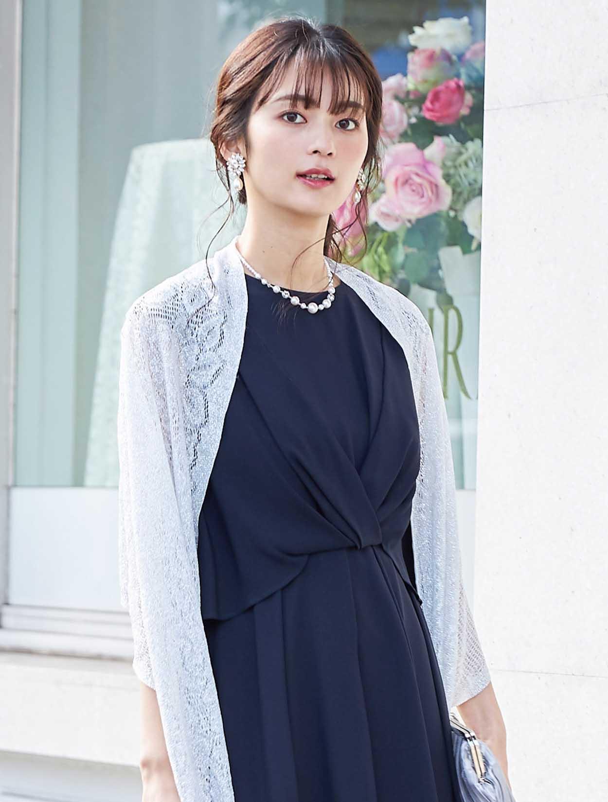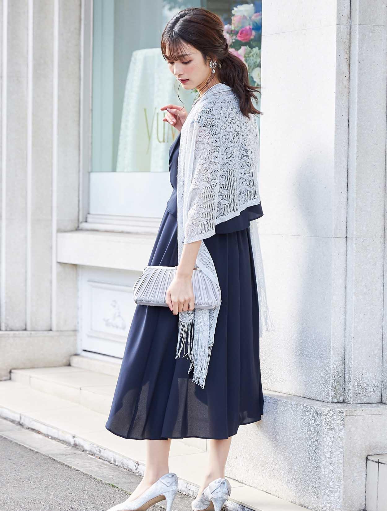 シンプルなネイビードレスが引き立つシルバーのショールを合わせたコーディネート。