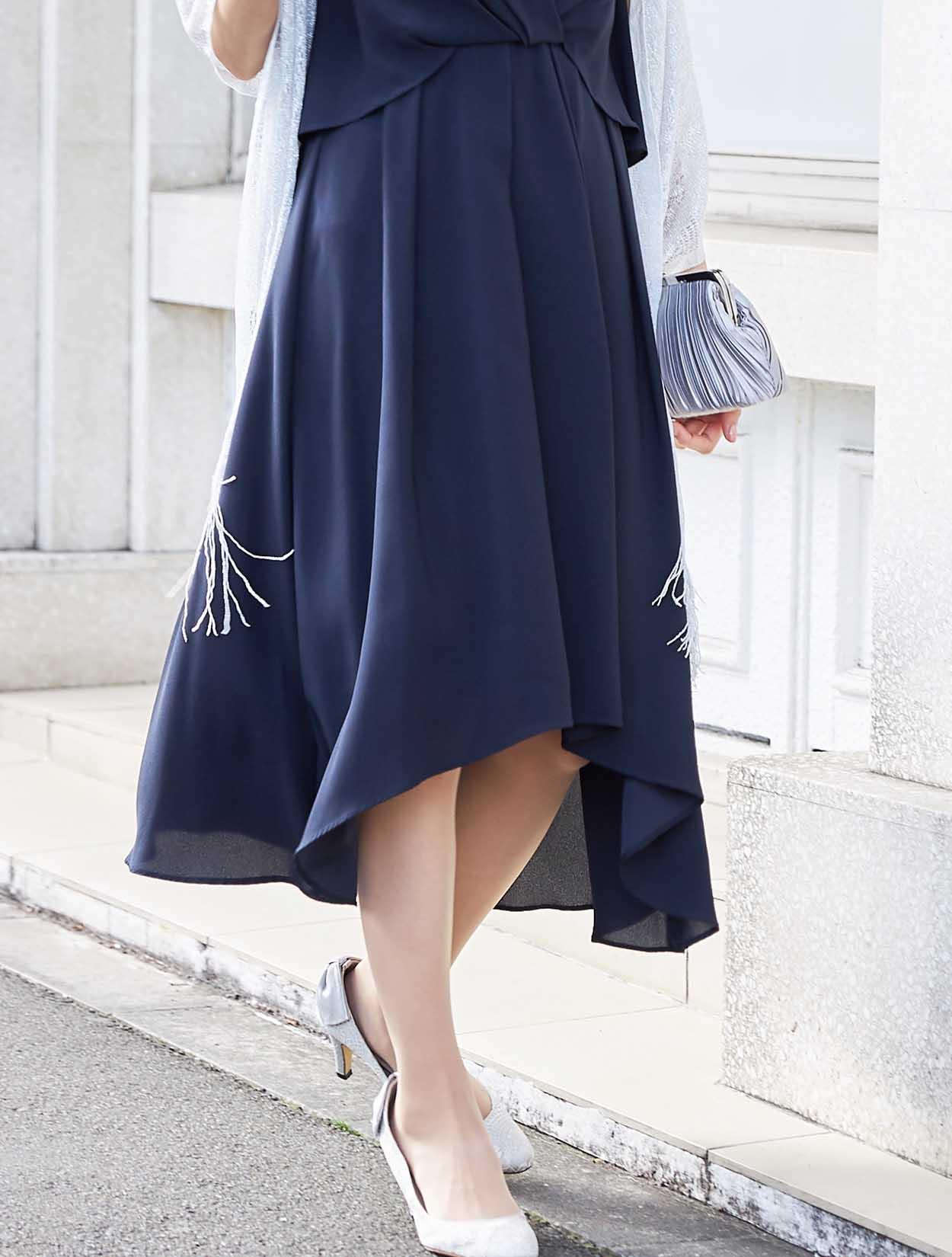 バックスタイルが軽やかな定番ネイビーのミディ丈ドレス