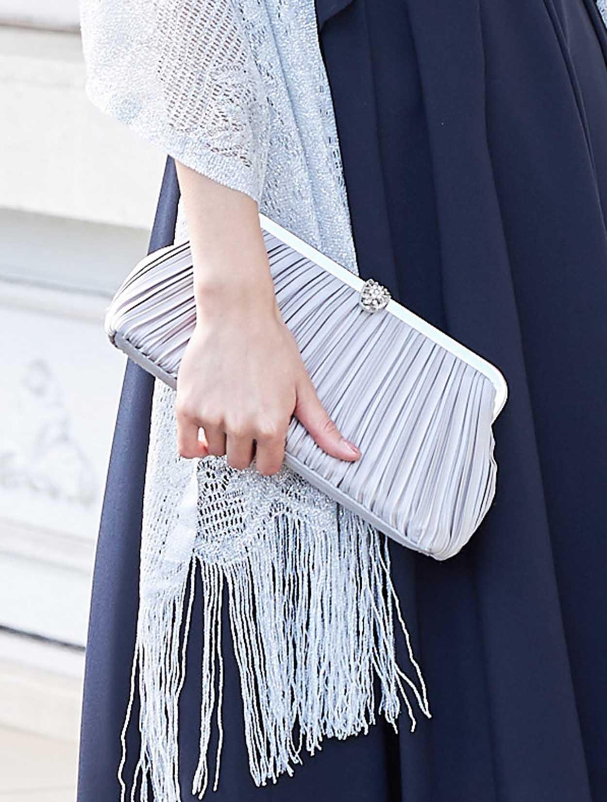 落ち着いたネイビーのドレスには、シャープなシルバーの小物合わせで華やかさをプラス。