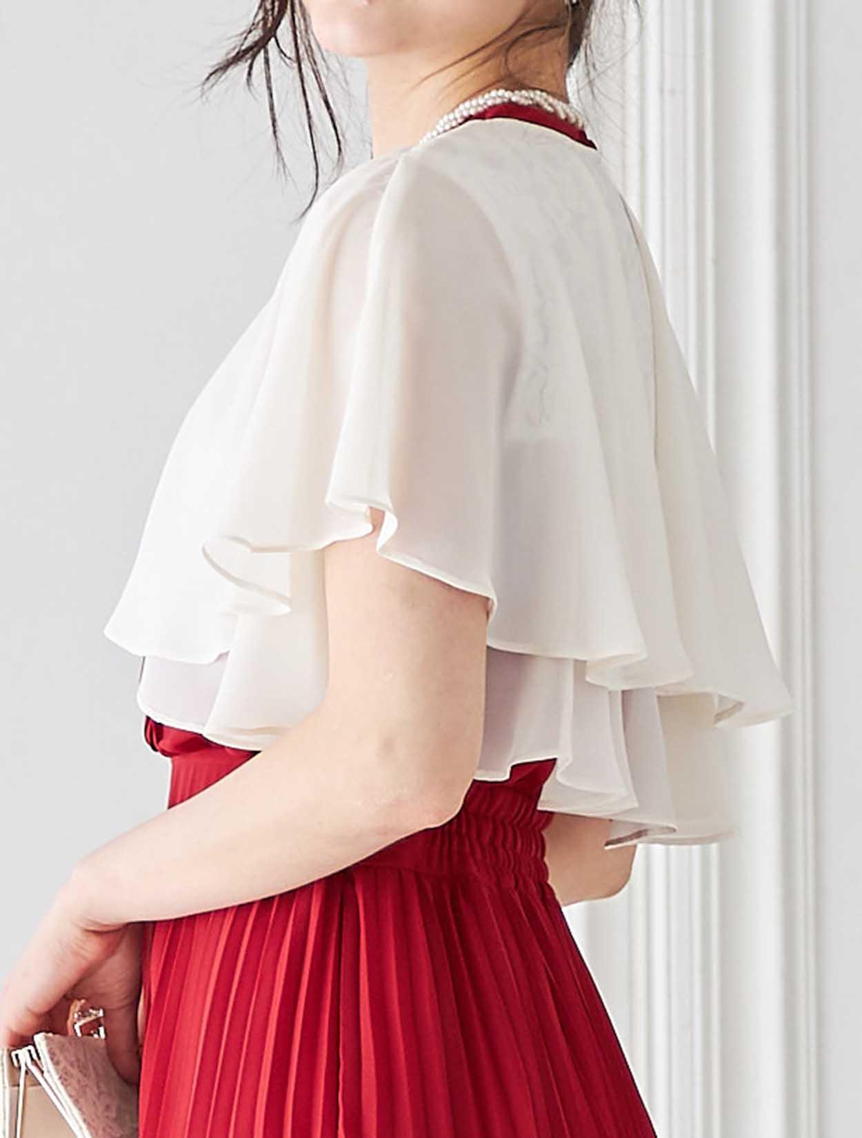 ライトな着心地で程よい透け感のあるシフォン生地を使用。上品に落ちて揺れるプリーツが大人の表情のドレス。