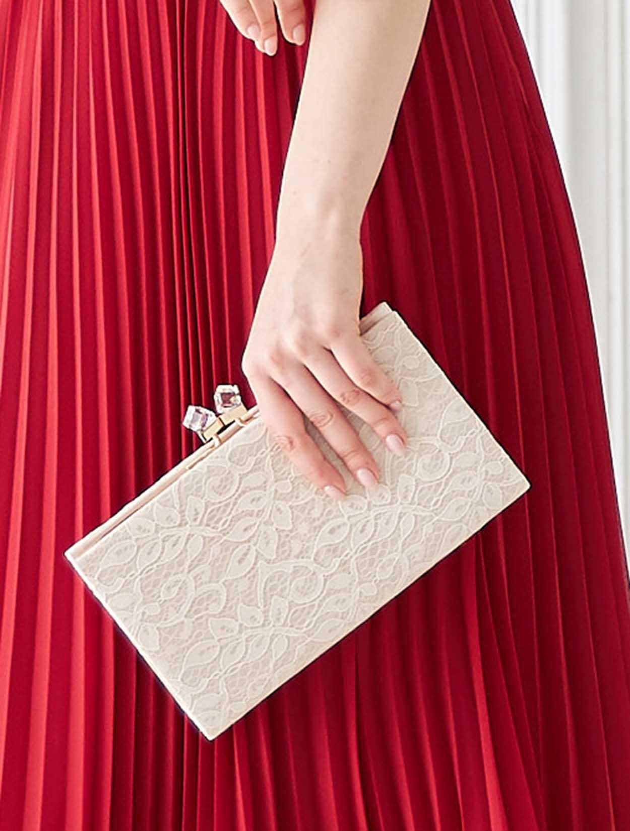 優しい印象のベージュのレースを重ねたバッグが、鮮やかなドレスを上品な表情に。