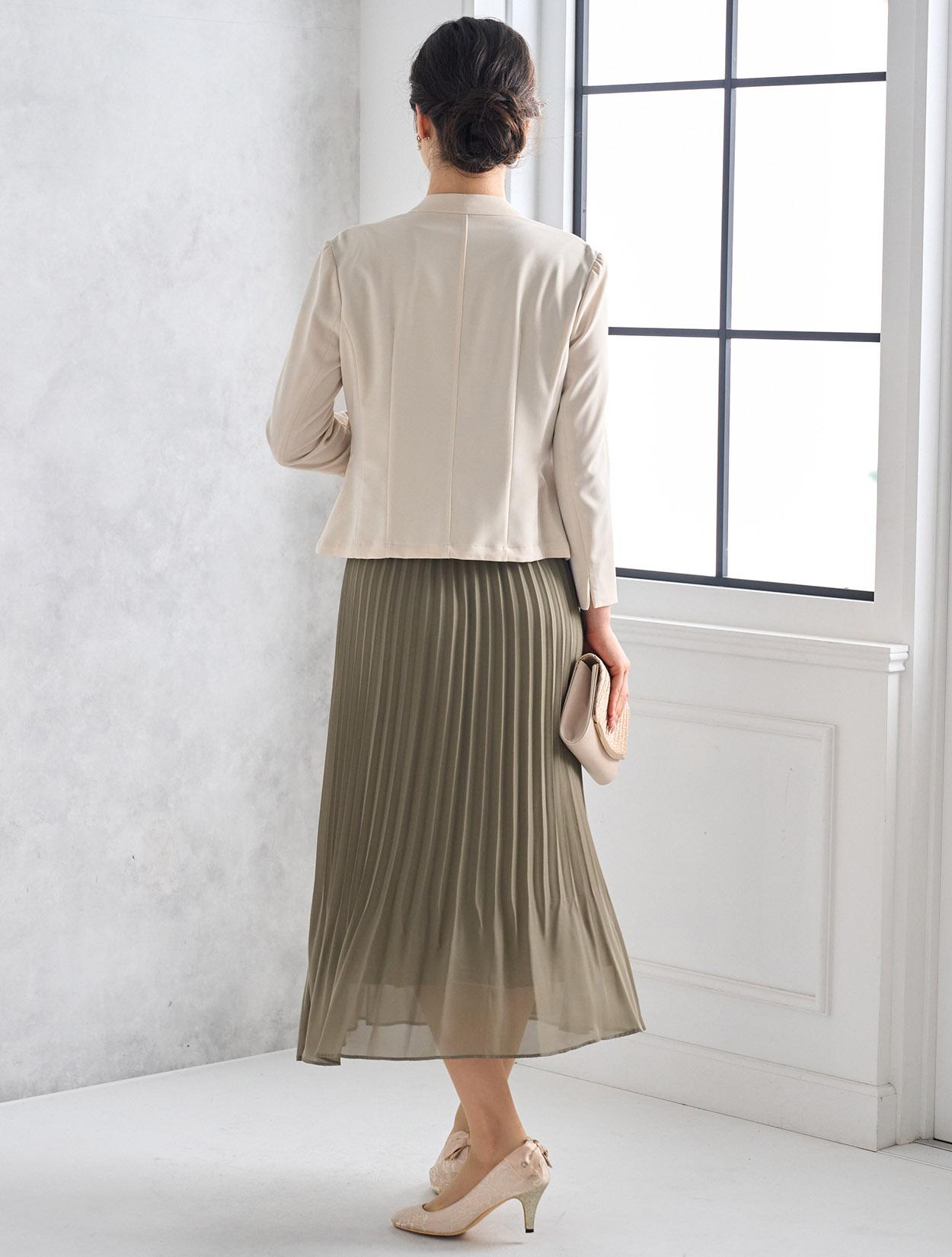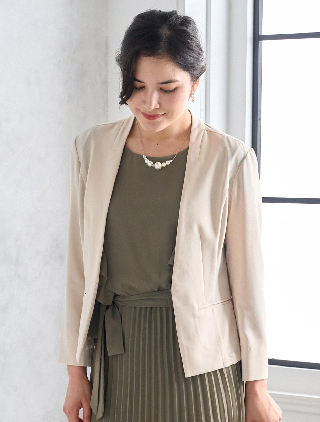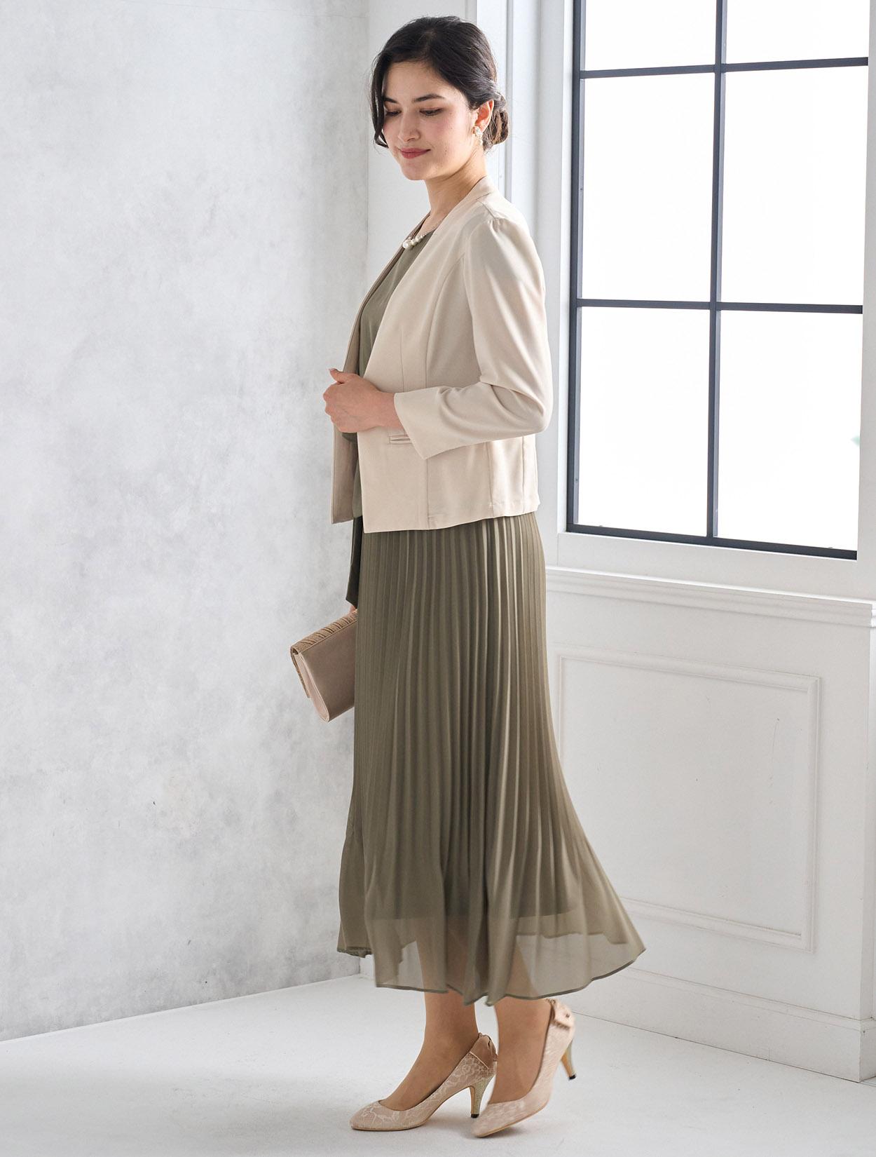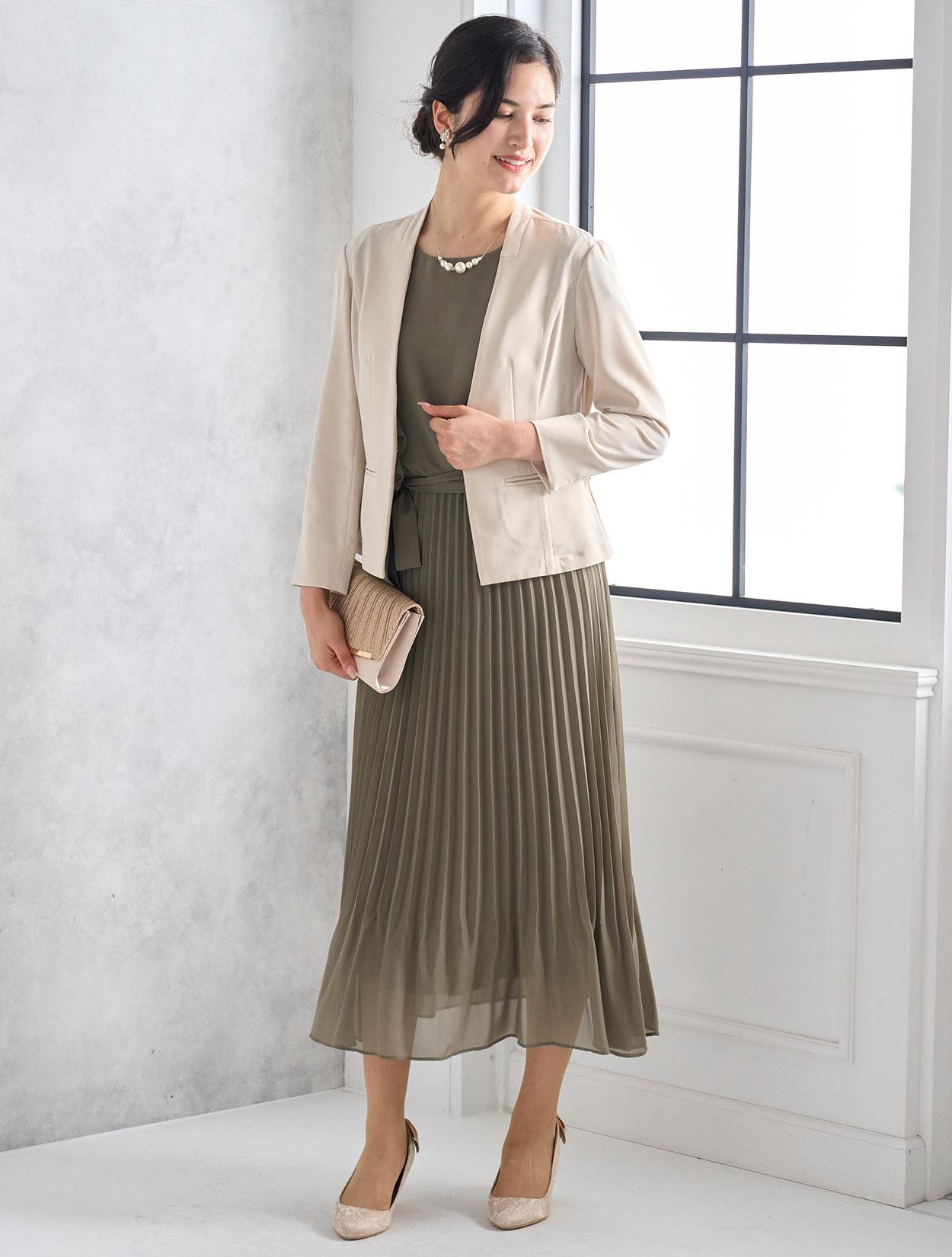 ベージュのジャケットを合わせたきちんと感のあるコーディネート。全体は明るい印象になりますが、着丈の長めのジャケットが派手さを抑えてくれます。親族でもカラーのあるドレスを着たい方にもおすすめです。