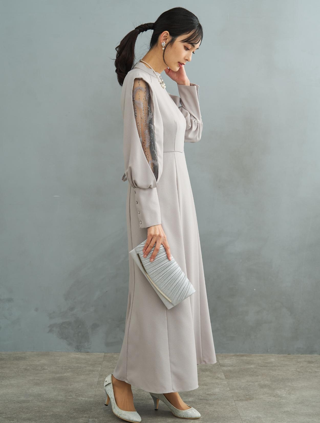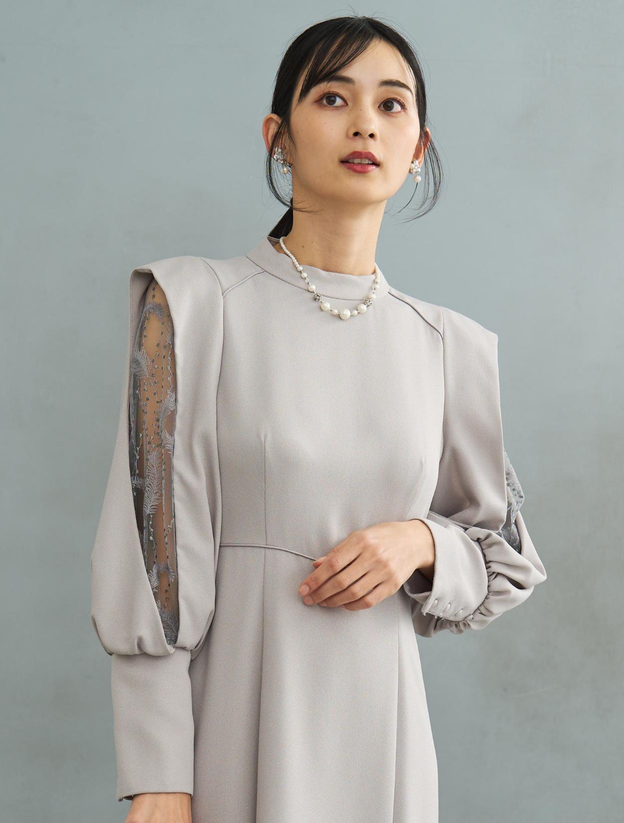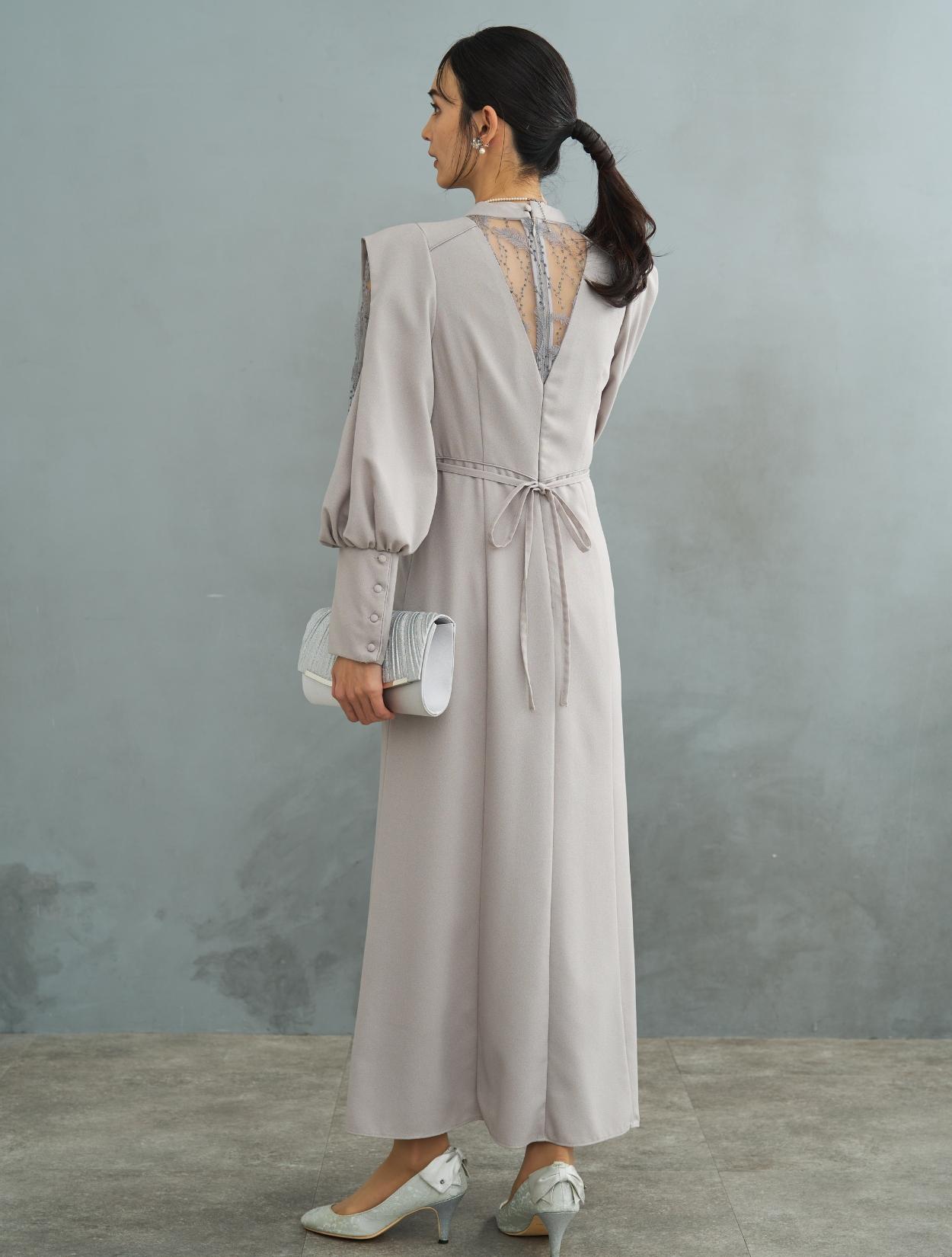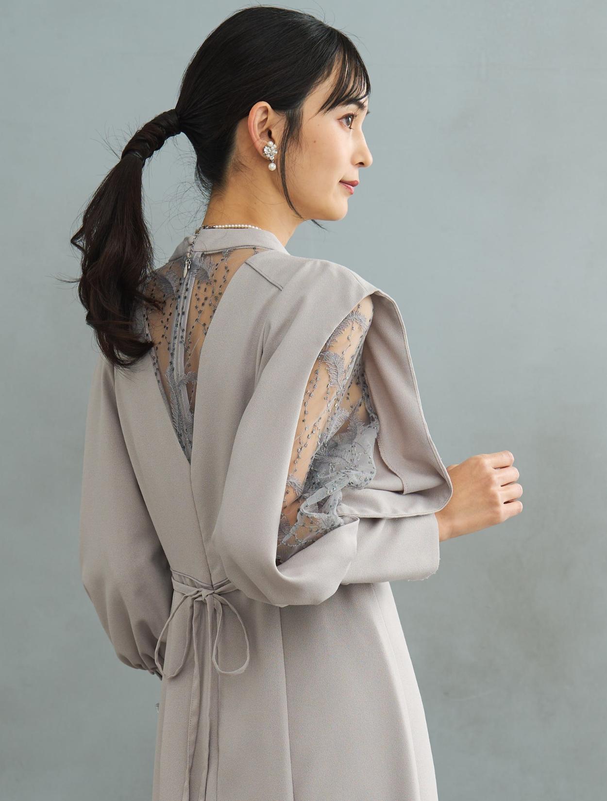 デザイン性がありトレンド感のあるワンピースドレス。しっかりしたジョーゼット生地は露出が少なく上品に着こなせるので特に30代に人気です。肩からお袖にかけてポイントのあるドレスで、スリットが入ったお袖から覗く刺繍のレースがポイント。ラメドットにリーフ柄の刺繍レースは、フラワーレースより大人っぽくおしゃれに着こなせます。同じレースが背中にも使われています。バックスタイルも抜かりなく、露出が少ないデザインに女性らしい抜け感を演出してくれます。ウエストには共布の紐がついていて、背中でしばれますのでお好きなウエストラインに絞って着ることができます。