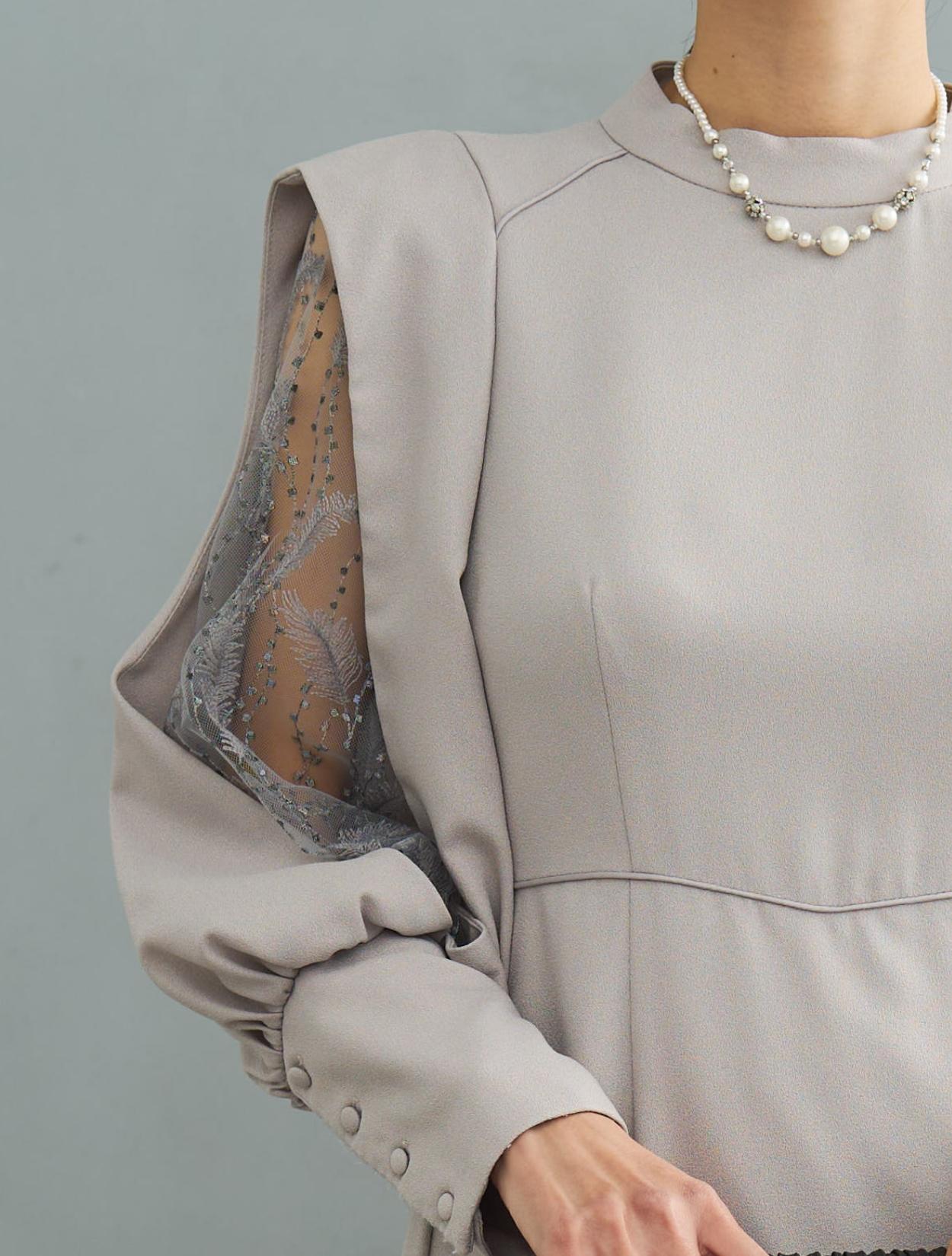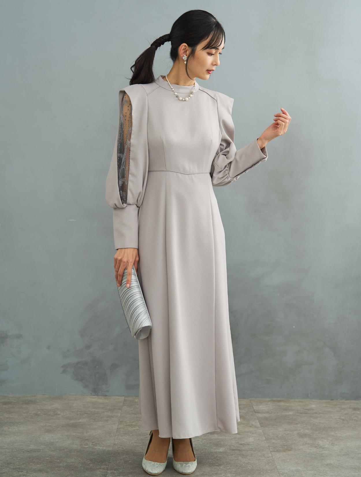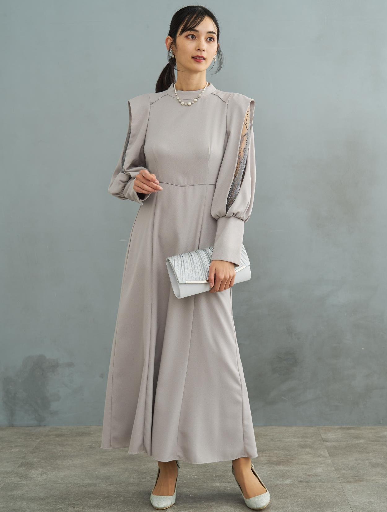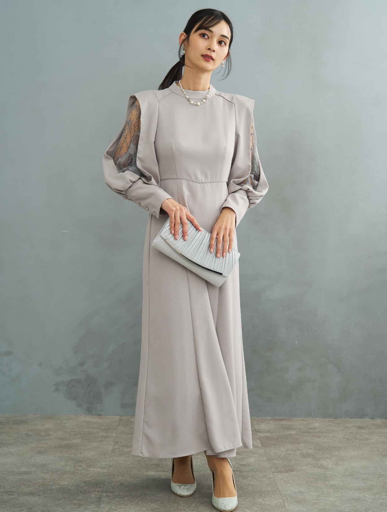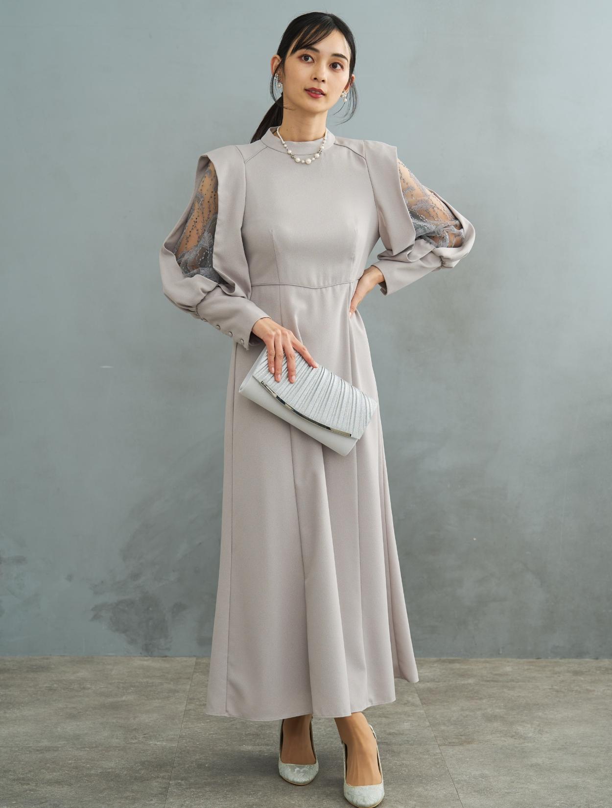 デザイン性がありトレンド感のあるワンピースドレス。しっかりしたジョーゼット生地は露出が少なく上品に着こなせるので特に30代に人気です。肩からお袖にかけてポイントのあるドレスで、スリットが入ったお袖から覗く刺繍のレースがポイント。ラメドットにリーフ柄の刺繍レースは、フラワーレースより大人っぽくおしゃれに着こなせます。同じレースが背中にも使われています。バックスタイルも抜かりなく、露出が少ないデザインに女性らしい抜け感を演出してくれます。ウエストには共布の紐がついていて、背中でしばれますのでお好きなウエストラインに絞って着ることができます。