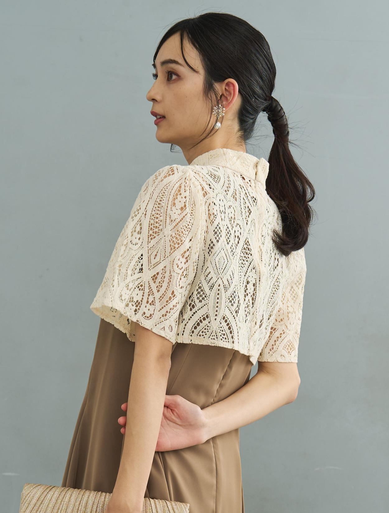ショート丈のオーバーブラウスがセットになった、トレンド感のあるデザインのドレス。ロング丈ドレスでも、全体のポイントを上に持ってきているので、足長効果やスタイルアップ効果も抜群です。人気のマーメイドスカートのインナーワンピースには、微光沢があるのでお呼ばれにもぴったりなきちんと感もあります。ウエストからヒップにかけての、女性らしいキレイなラインも嬉しいポイント。オーバーブラウスのレースには程よい厚みがあり、透け感も気にならず上品に着こなせます。ハイネック風の首元ですが、ゆとりがあり締め付けは気になりずらいデザインです。デコルテ部分の露出は抑えて、ハーフスリーブからは肘下を大胆に出すバランスが◎。着崩れしないドレスなので、受付や代表スピーチなどを任されている方にもおすすめ。