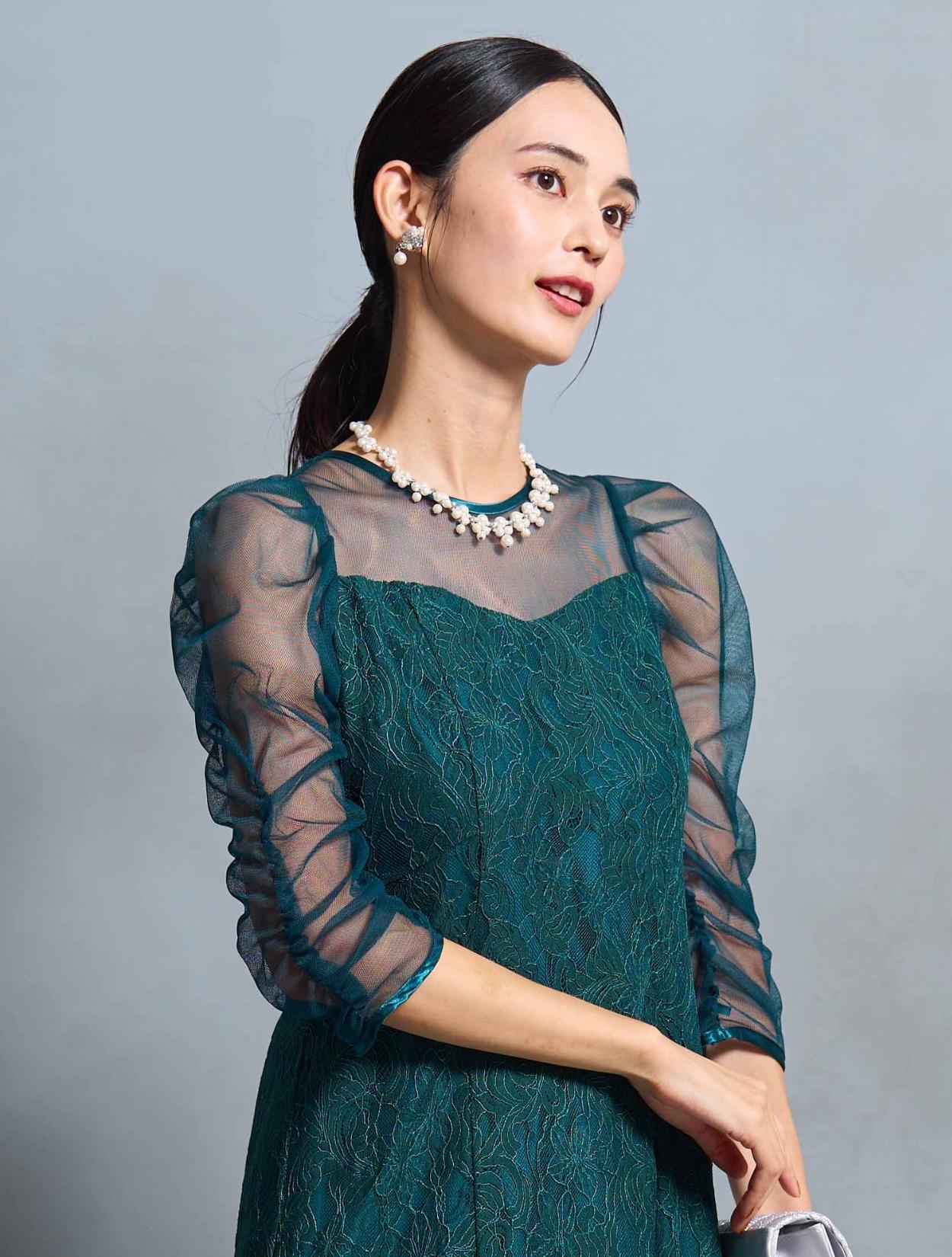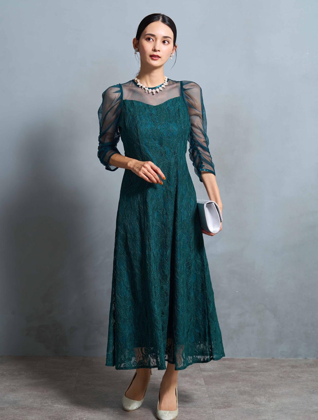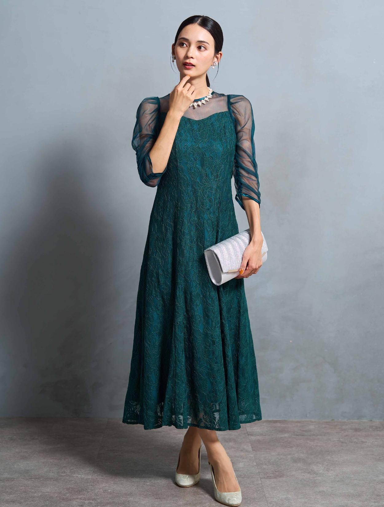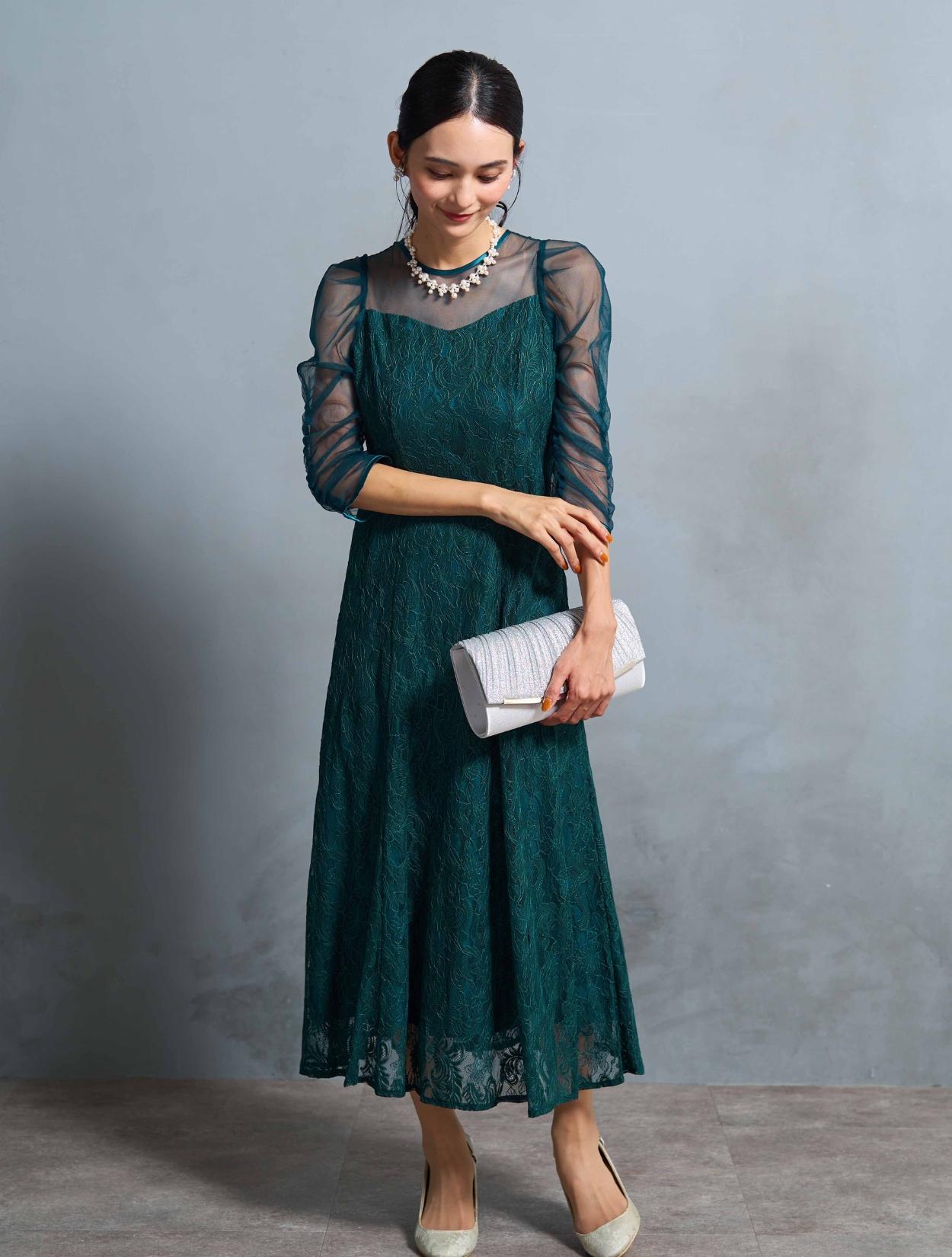 結婚式や二次会・パーティーはもちろん、成人式や同窓会・謝恩会や卒業パーティーにもおすすめです。顔合わせやお食事会、ドレスコードのあるアフタヌーンティー、婚活パーティー、ディナーショーなどのドレスコードがある会場でもご利用いただけます。袖ありドレスで着丈もしっかりあるので、受付や代表スピーチをする方にもおすすめです。グリーンは20代30代の親族ドレスとしても着られます。