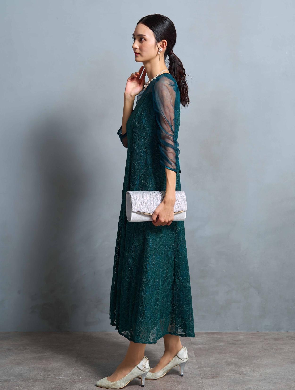 グリーンのドレスにシルバーのバッグを合わせたすっきりと着こなすコーディネート。明るい印象になりながらも、クールな着こなしができます。華やかなスカラップ調のネックレスは、写真写りも良くSNS映えします◎