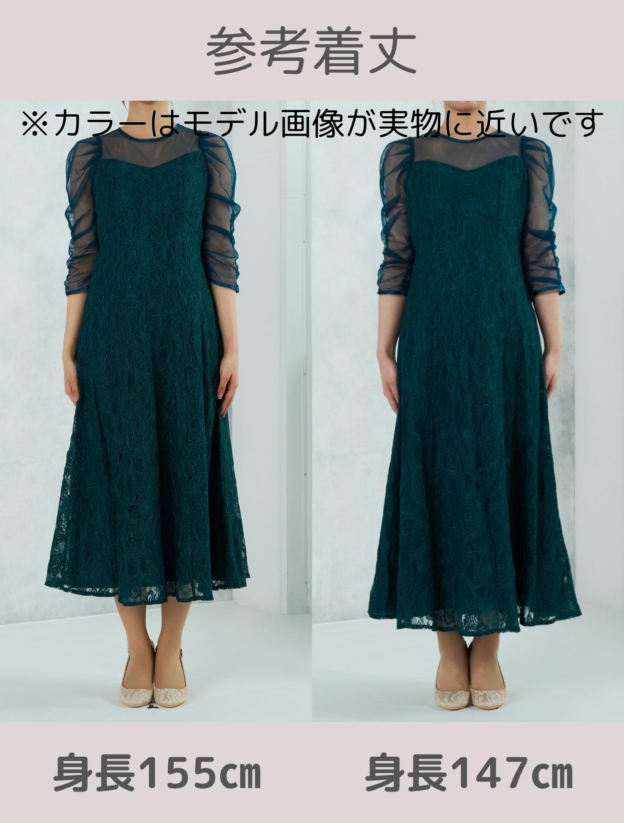 高級感のある上品なレースが目を惹くドレス。デコルテからお袖にかけてはシンプルなシアーチュールが使われているので、レースドレスでも甘くなり過ぎず幅広い年代におすすめです。ギャザーを寄せたお袖のデザインはお顔周りを華やかに見せてくれて、写真写りも良くSNS映えします◎。肩幅が気になる方でも着こなしやすい、控えめなボリューム感なのも嬉しいポイントです。ウエストには華奢なリボン紐が付いているので、キュッと絞って細身の方でもキレイに着こなせます。さりげなくウエストマークできるのでスタイルアップ効果もあり。首元も開きすぎないデザインなので、Sサイズや低身長の方でも着こなしやすいドレスです。ボリュームを落としたフレアスカートは、全体のバランスをすっきり大人っぽく見せてくれます。