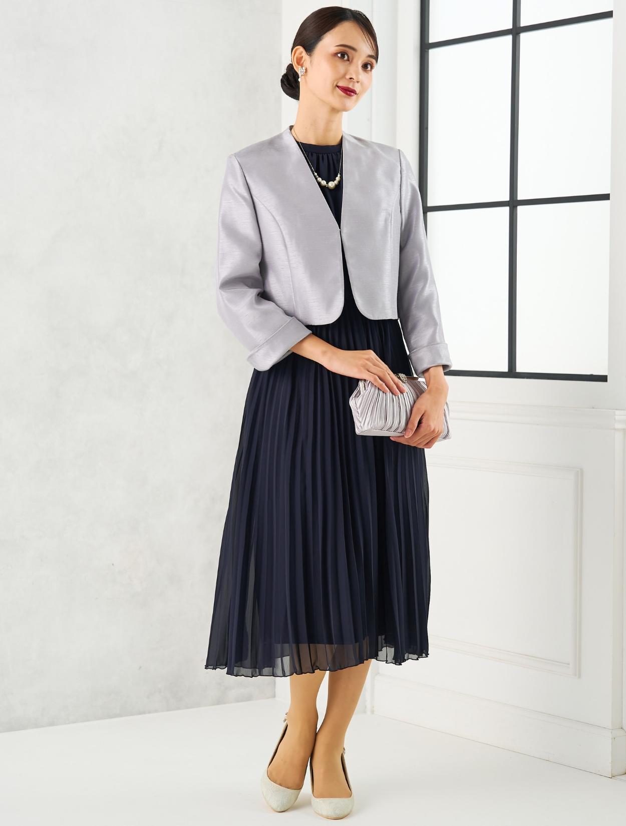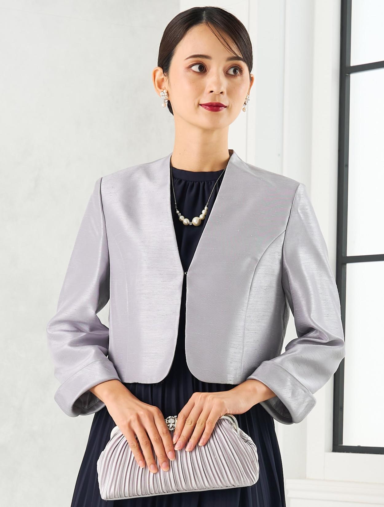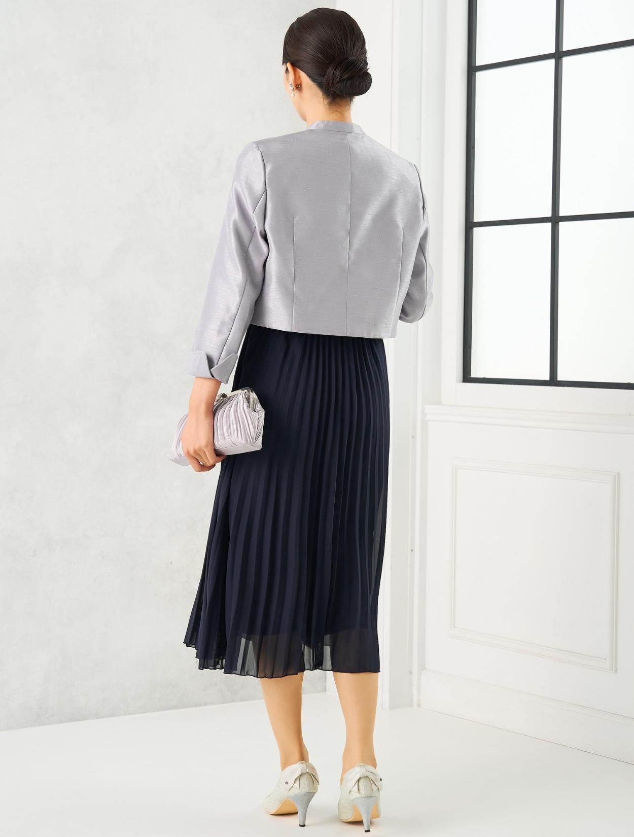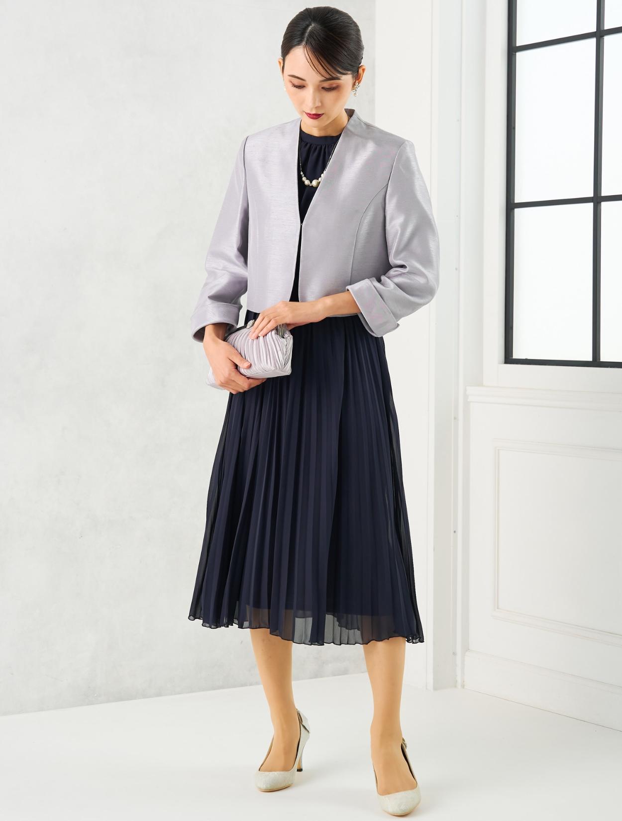 高級感のあるシャンタンジャケットを合わせた親族向きのコーディネートセット。きちんと感があり露出を抑えた上品なコーデです。低身長の方にもおすすめ。